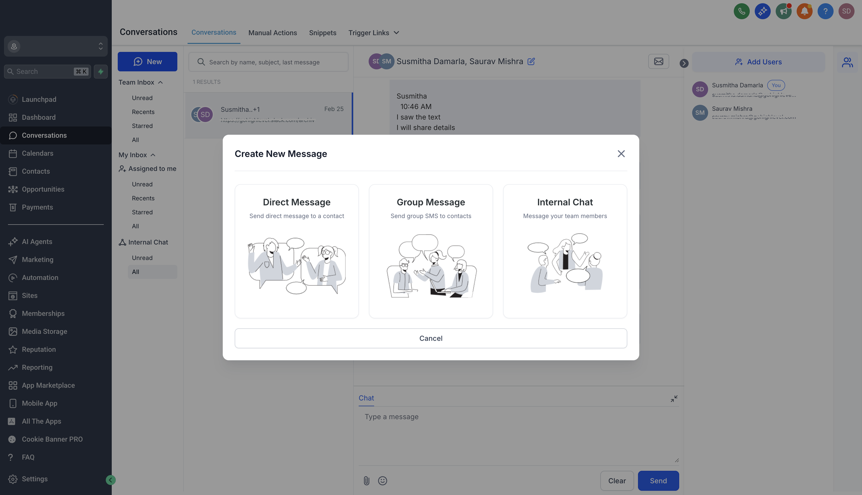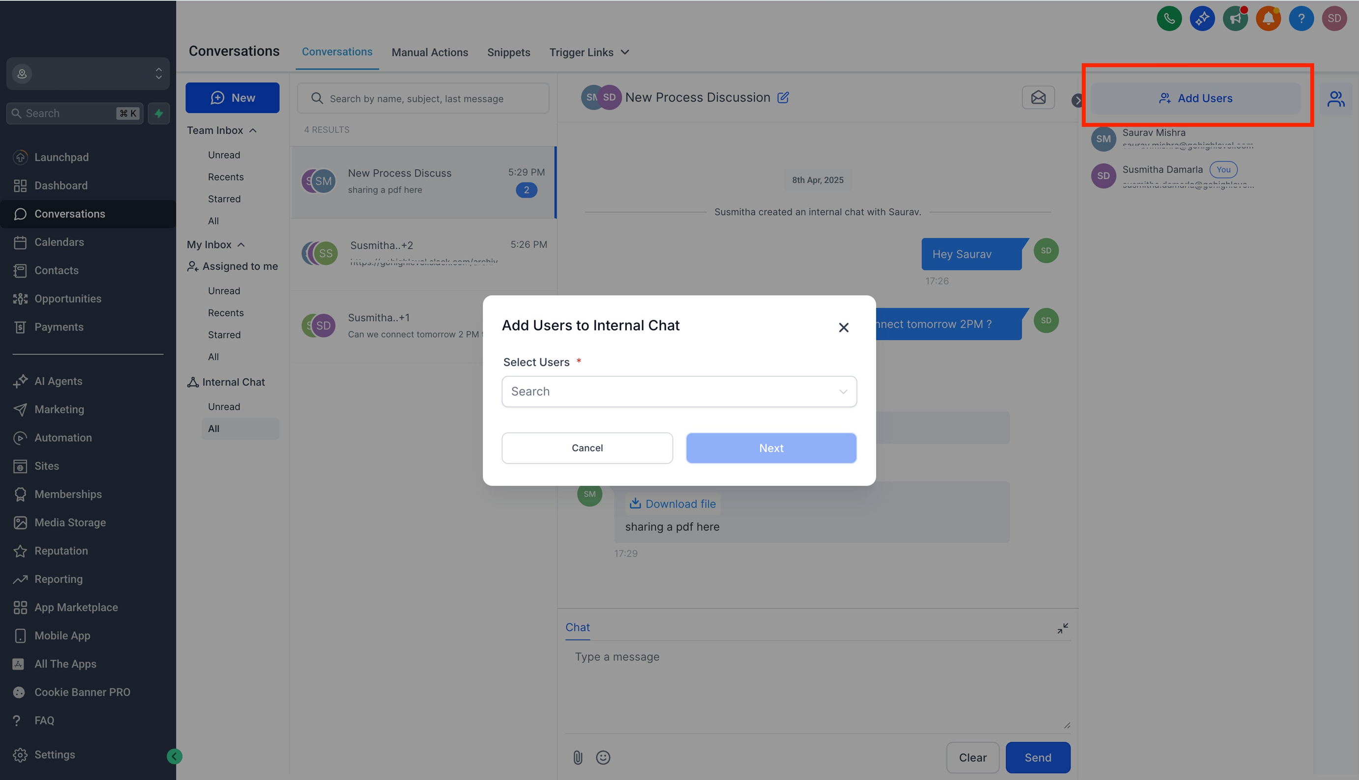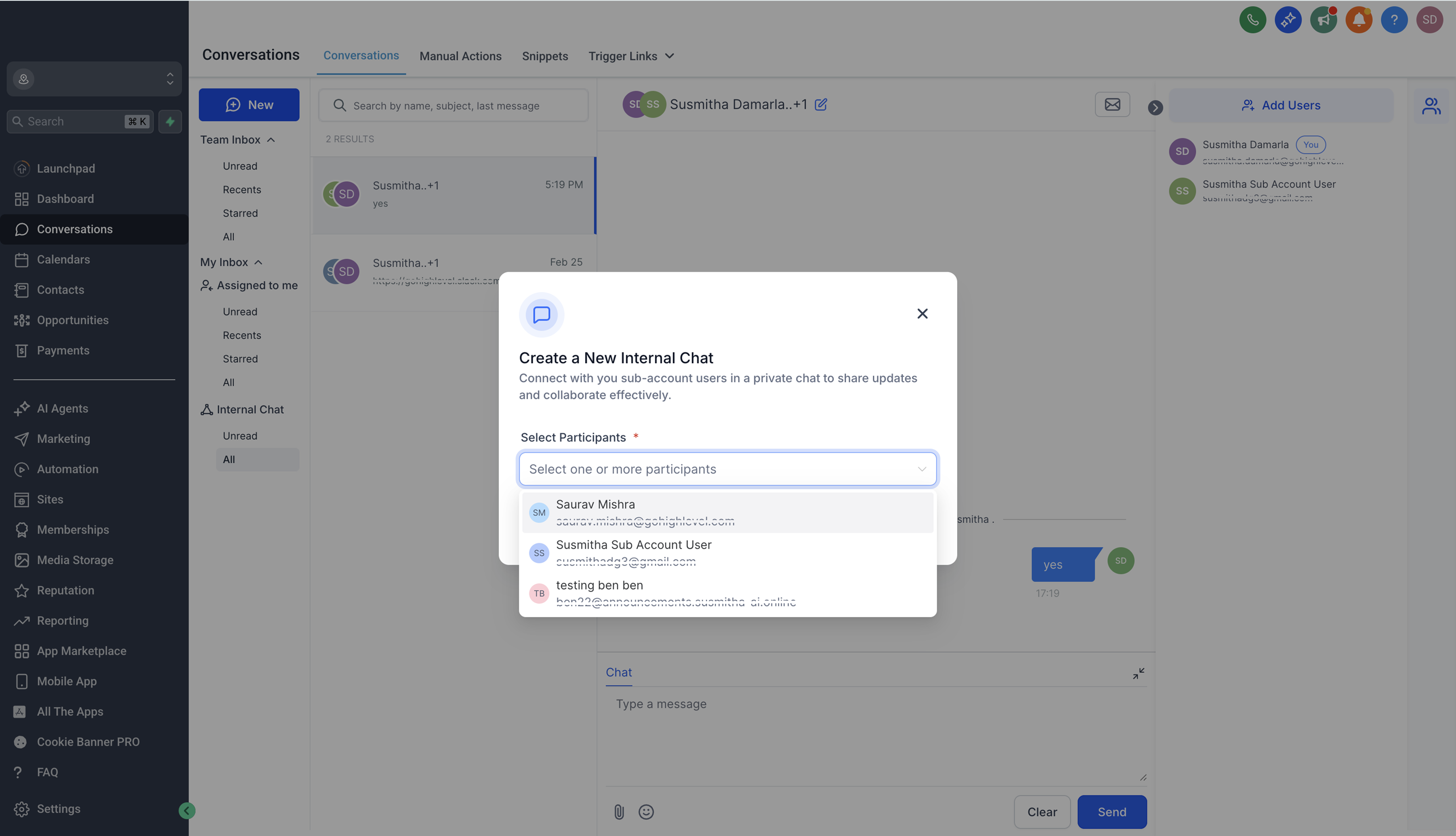 Agency Admins/Users can create internal chats even if they are not part of a sub-account.