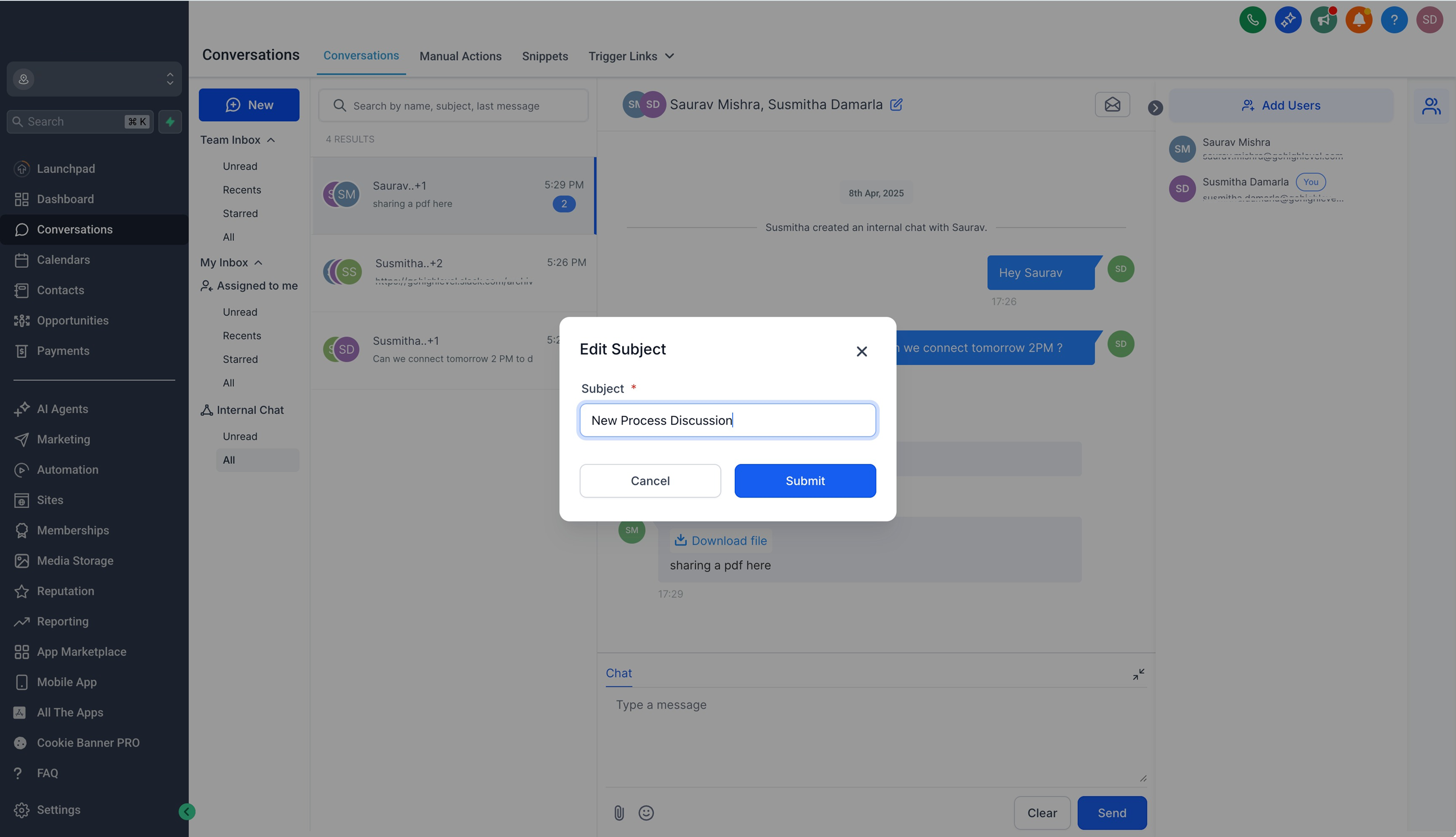 To organize conversations better, you can add a subject by clicking the edit icon the top center panel. Once a subject is added, you can search for internal chats by subject, participant names, or the last message sent.