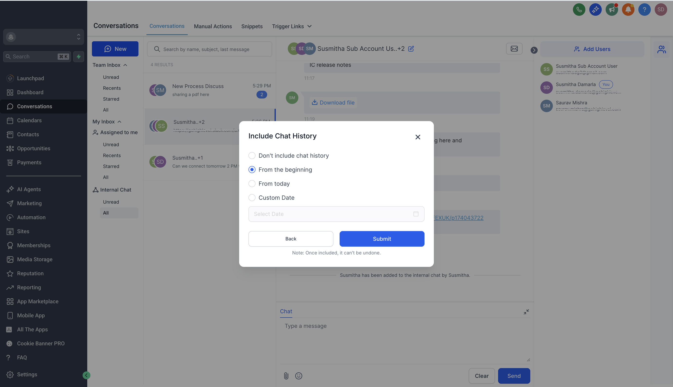 Select the team members to add and click Next. Choose whether they should have access to previous chat history. Click Confirm—once added, users cannot be removed from the chat.