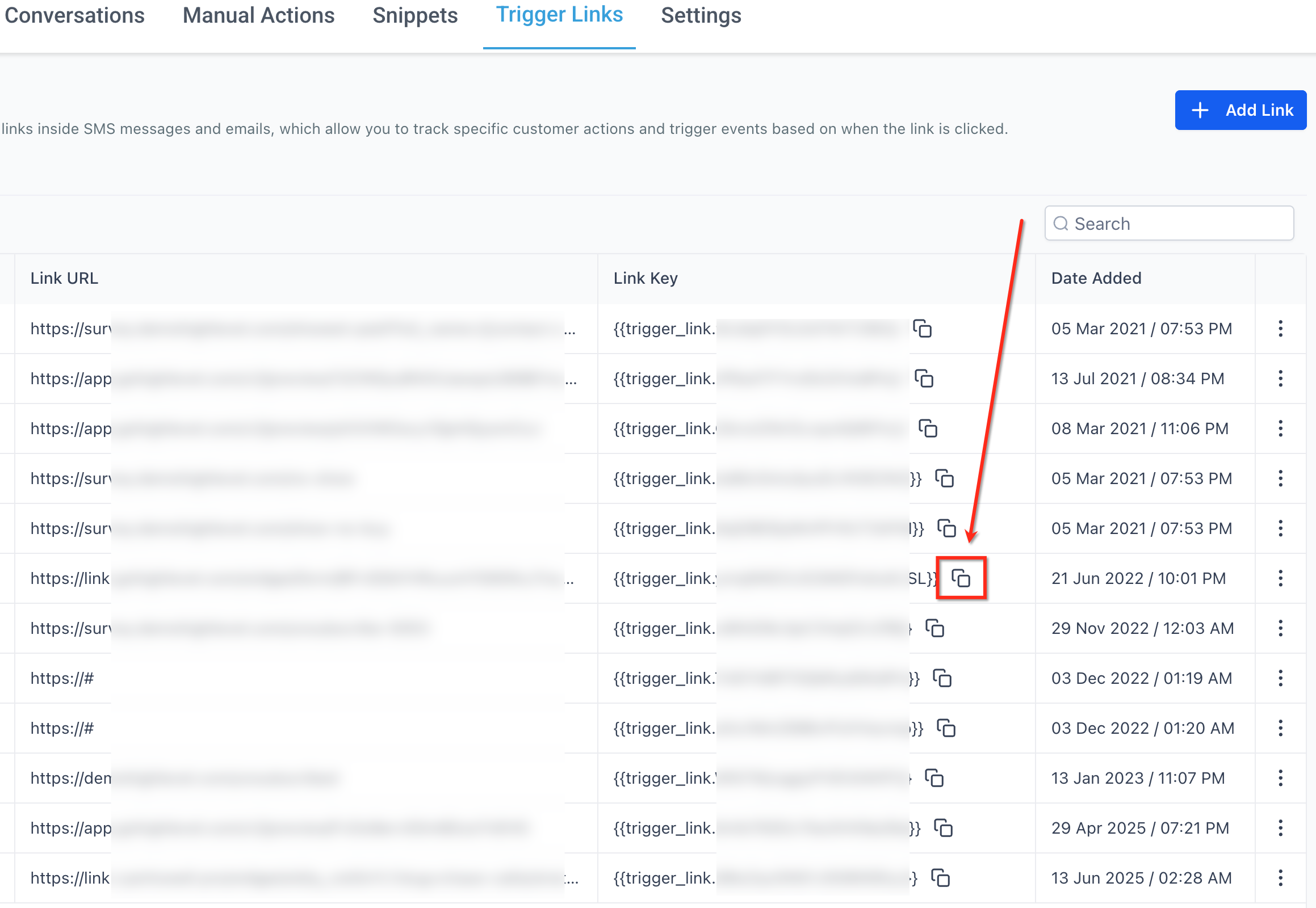 Click the copy icon beside the Link Key to place the merge code on your clipboard. Paste this key into emails, SMS, WhatsApp templates, or workflow actions to track clicks reliably.