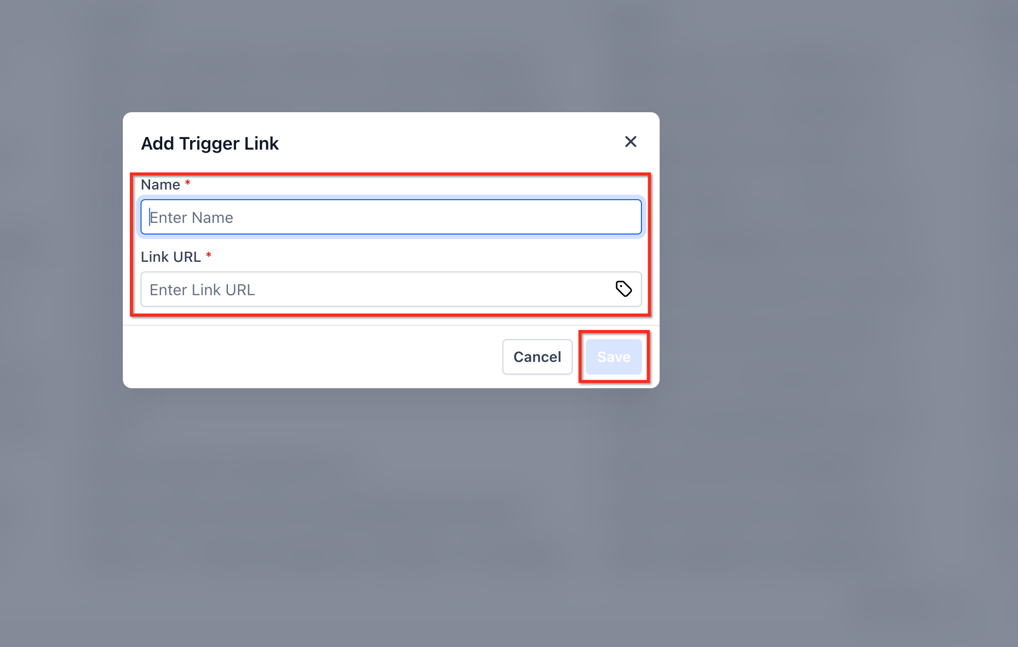 In the Add Trigger Link modal, enter a descriptive Name and paste the Link URL. Click Save to add it to your list; use the {} icon if you need to insert a custom value.
