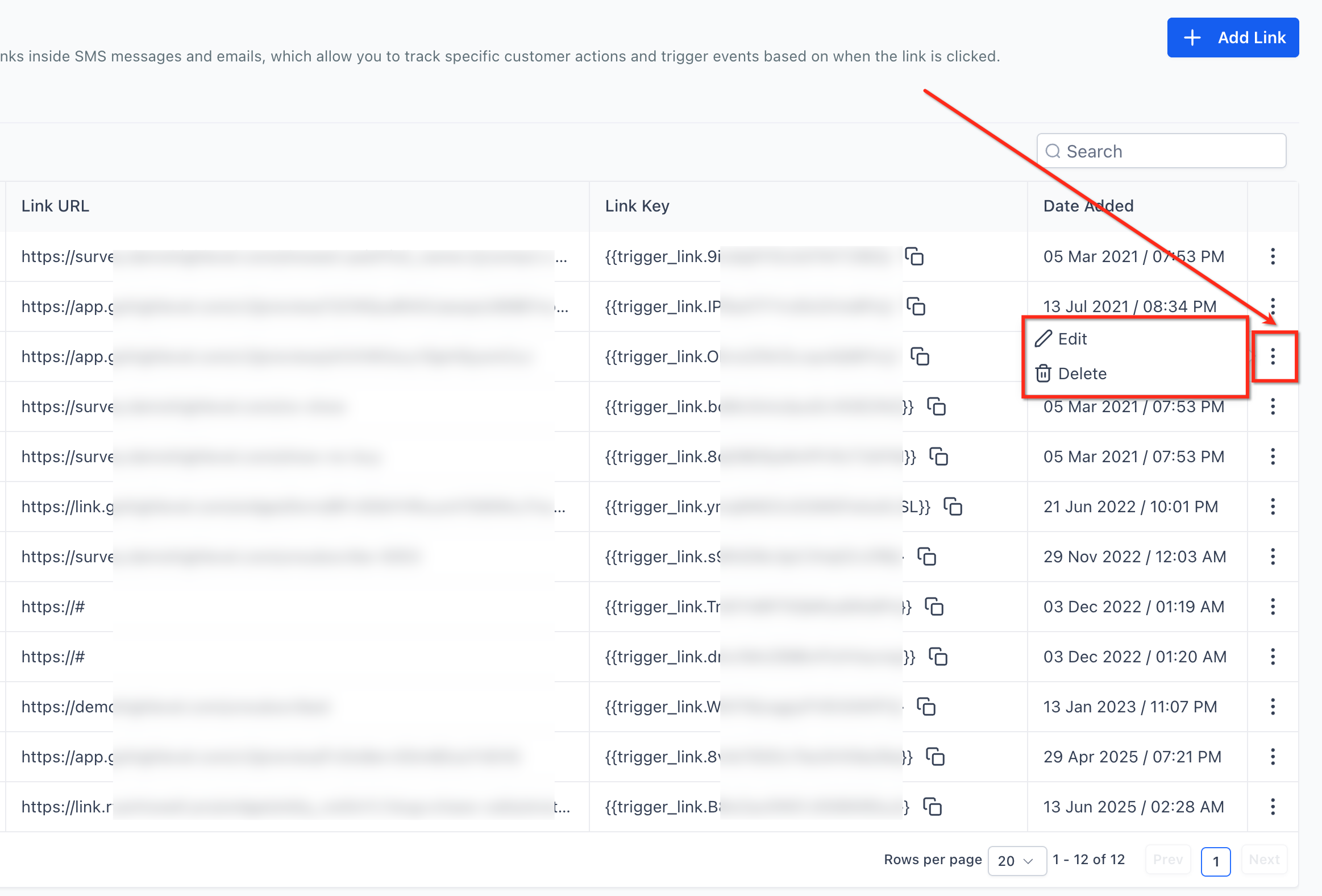 Open the row’s three-dot menu (⋮) to access Edit and Delete actions. This lets you correct URLs, rename links, or remove outdated items without leaving the page.
