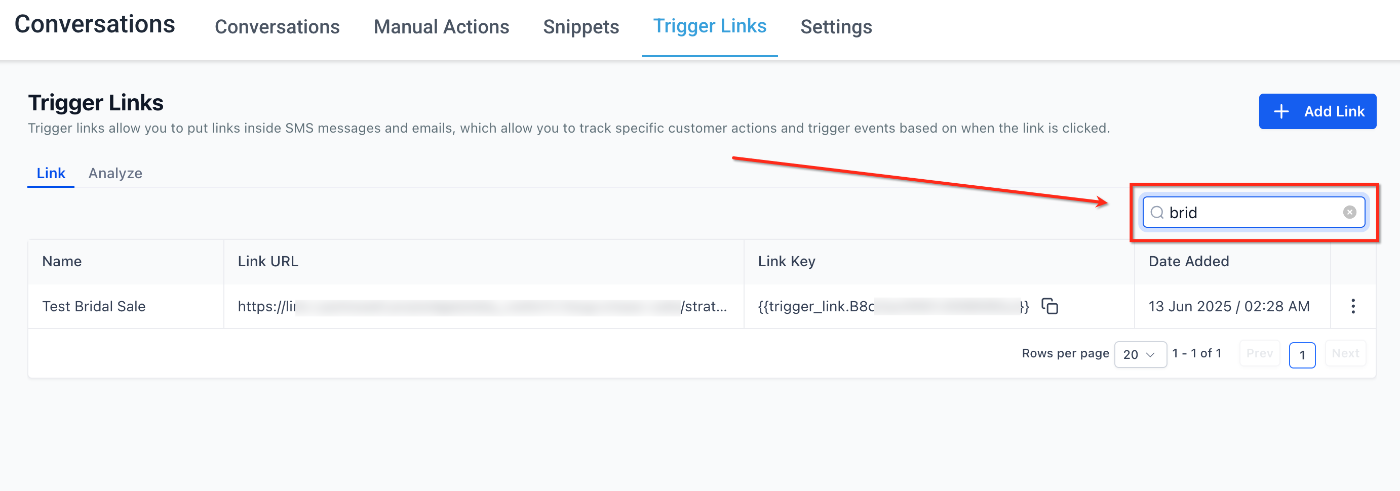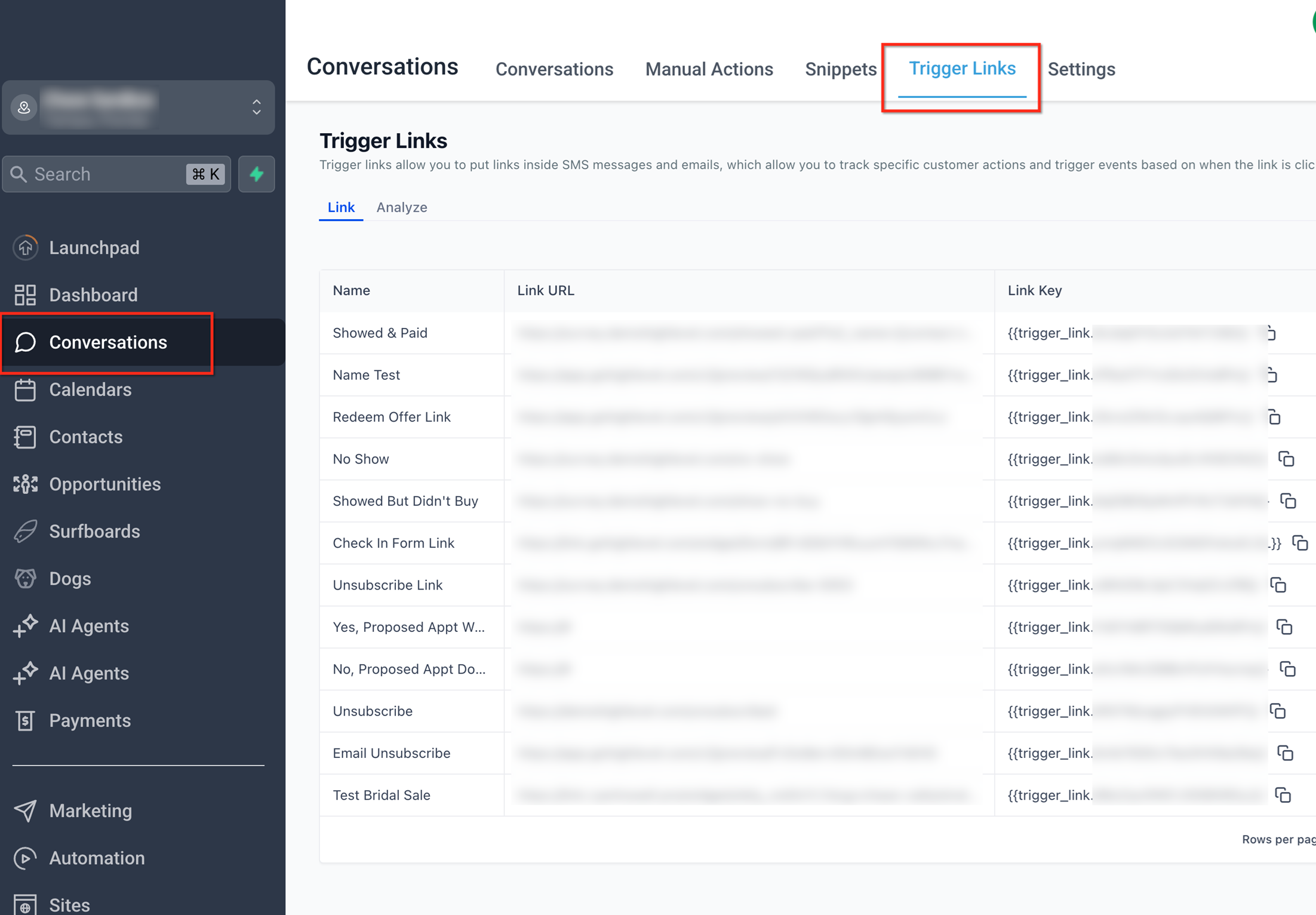 From the left sidebar, go to Conversations and select the Trigger Links tab at the top. This confirms you’re managing links inside the Conversations module, where clicks can be tracked and used in automations.