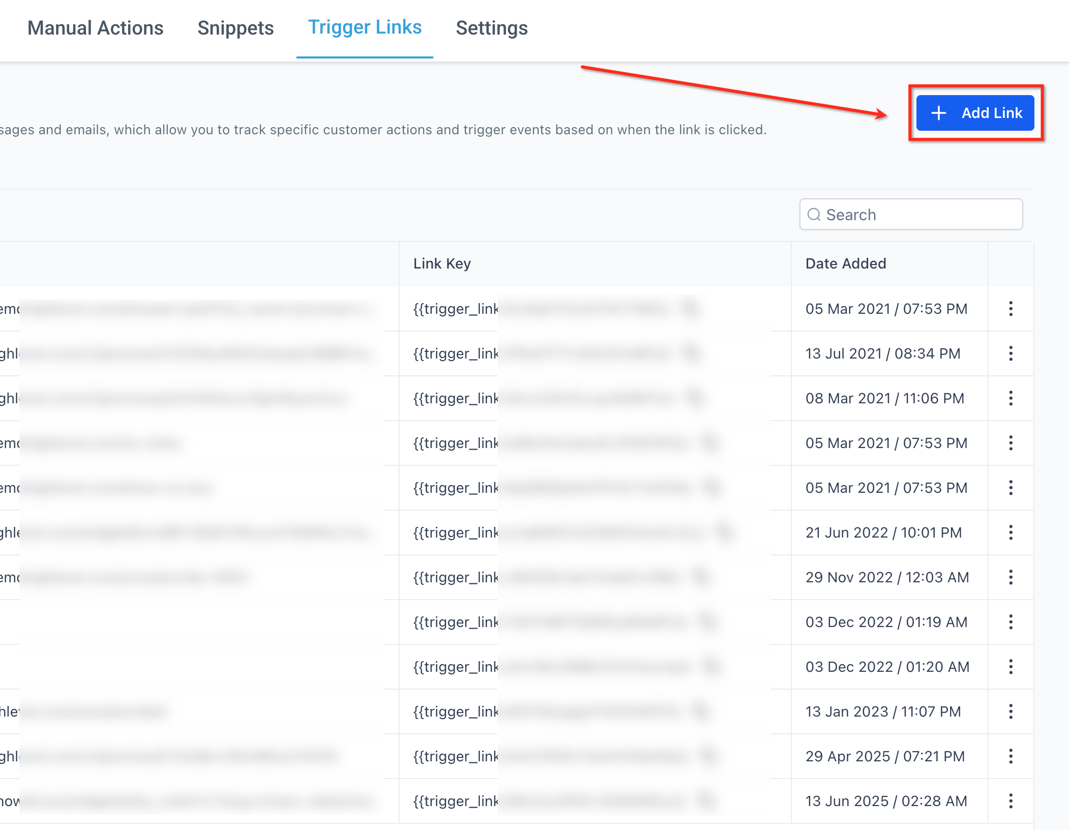Click the + Add Link button in the top-right to create a new trigger link. This opens the creation dialog so you can name the link and set the destination URL.