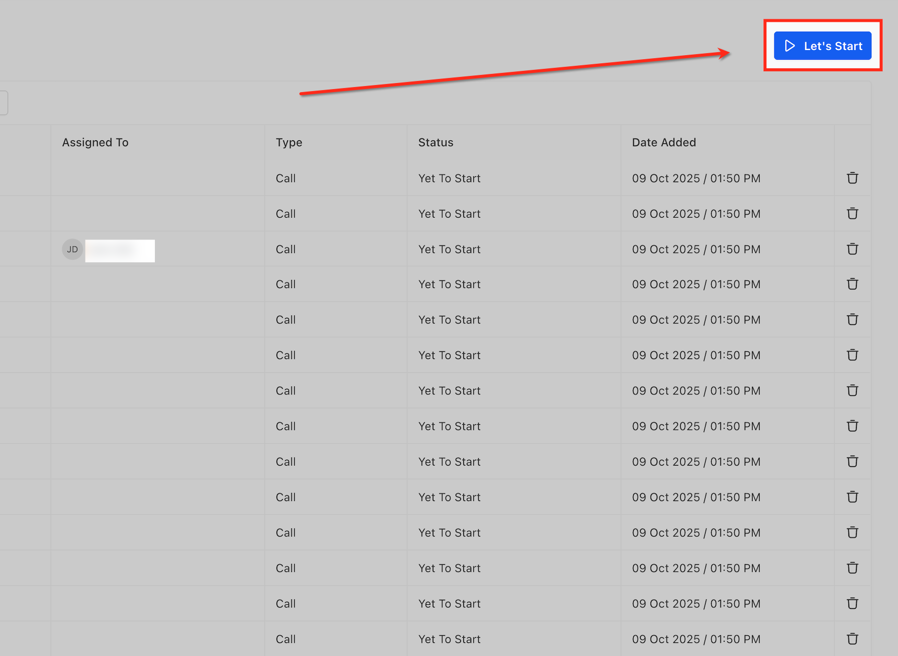 Click Let’s Start (blue button) to begin working through tasks. Log call outcomes or SMS replies in the side panel, then mark tasks as Complete, Skip, or Re-queue.