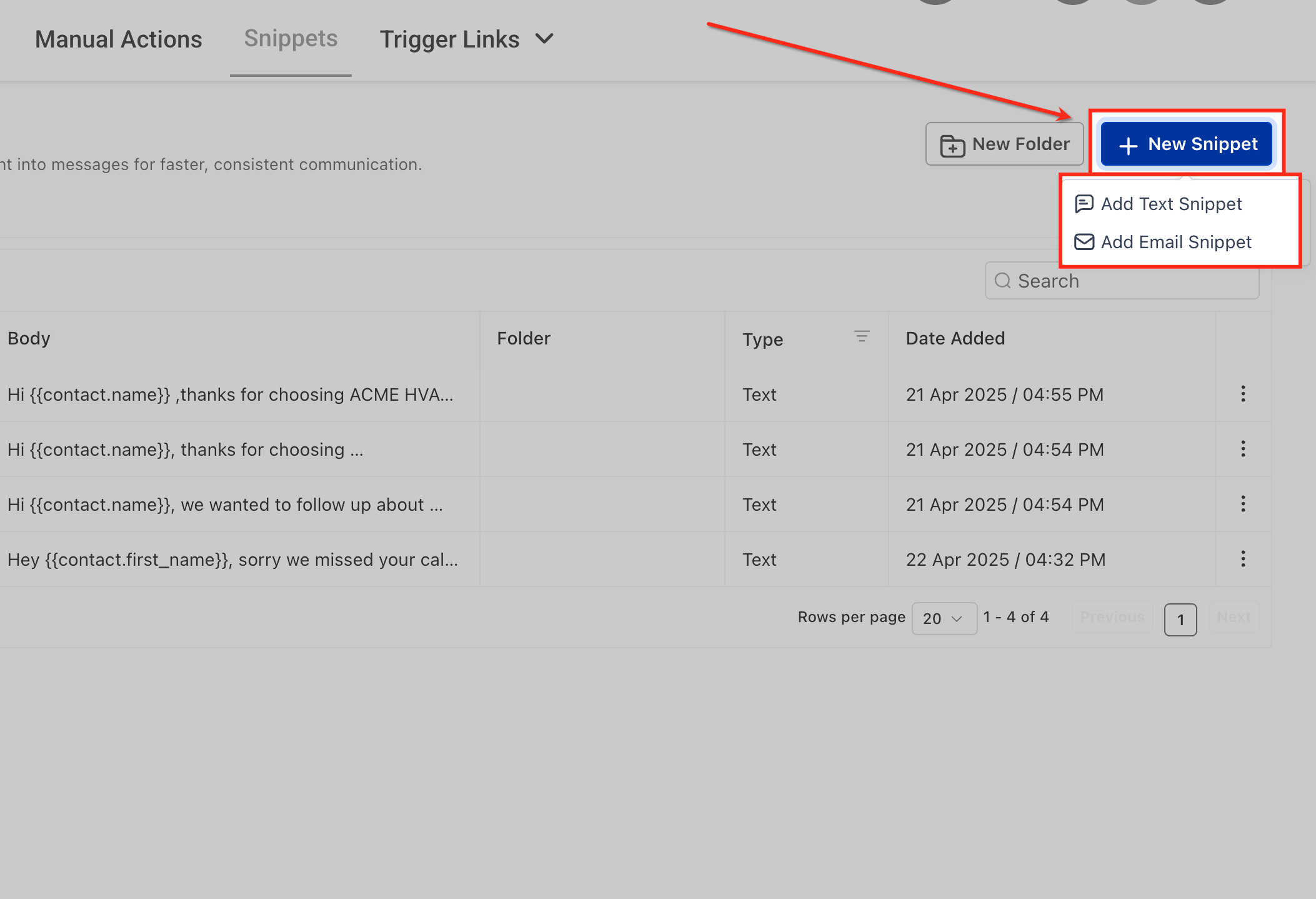 Click the + New Snippet button in the top-right corner and choose between Add Text Snippet or Add Email Snippet. This opens a new window where you can compose and save reusable content for faster and more consistent communication.