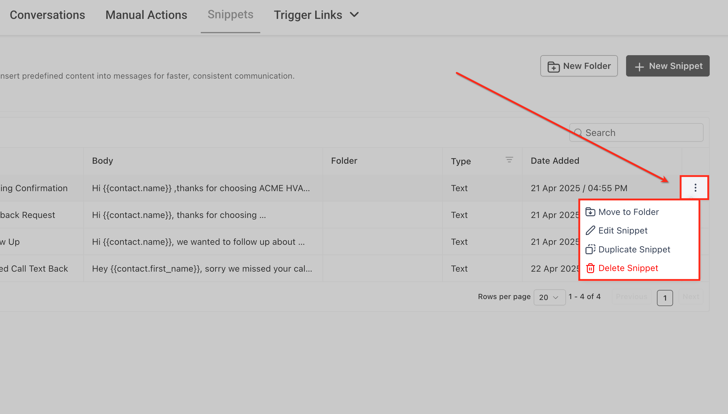 Click the three-dot menu (⋮) beside any Snippet to view management options such as Move to Folder, Edit Snippet, Duplicate Snippet, or Delete Snippet. These quick actions let you organize, update, or remove Snippets without leaving the main list view.