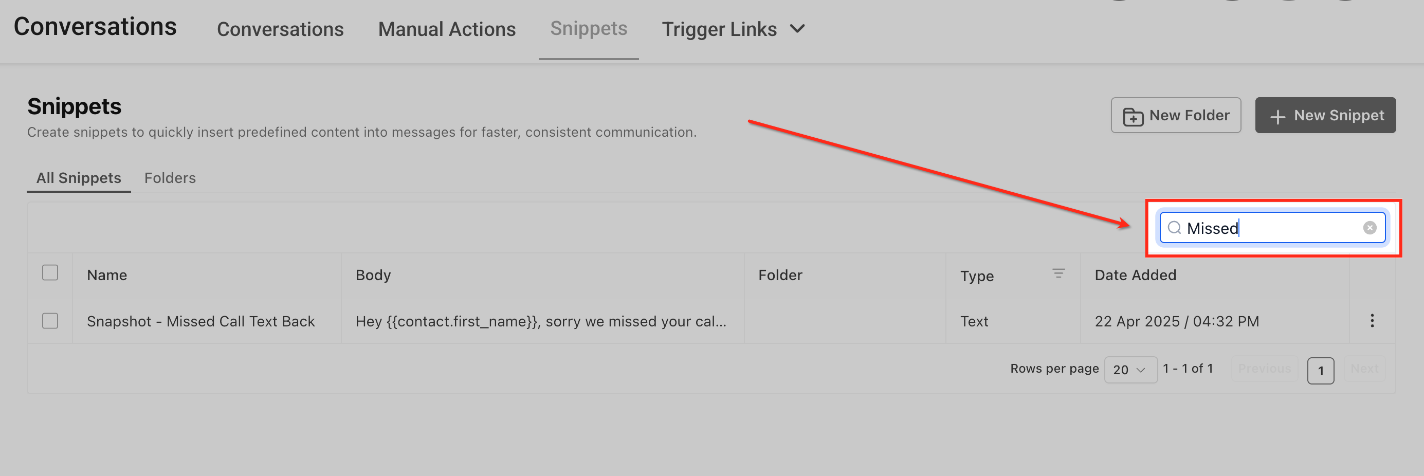 Use the Search bar on the right side of the Snippets page to quickly locate a specific snippet by name or keyword. As you type, the list filters automatically, displaying only the snippets that match your search term.