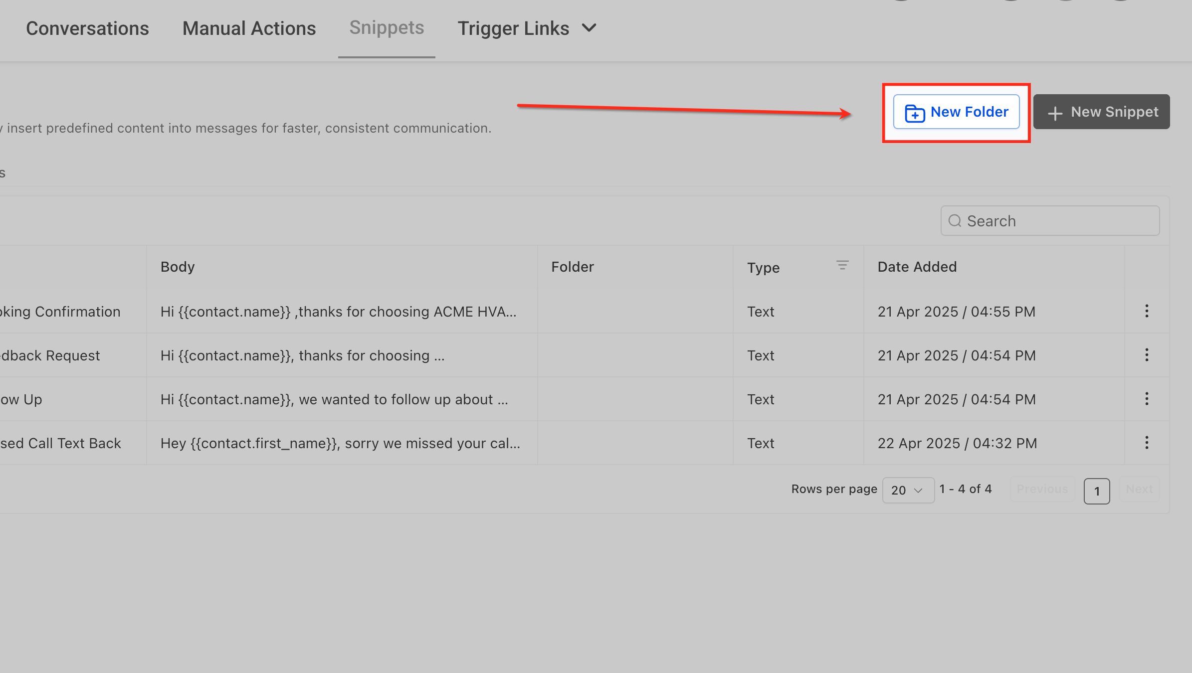 Click the New Folder button in the top-right corner to organize your Snippets by category or purpose. This helps you group related messages—like sales follow-ups or support replies—making it easier to locate and manage Snippets efficiently.