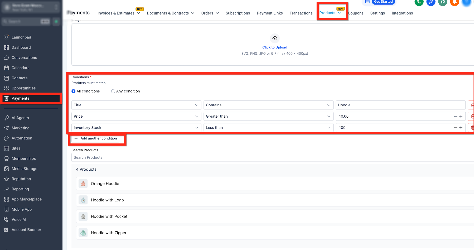 Conditions can be based on Title, Variant Title, Price, or Inventory.