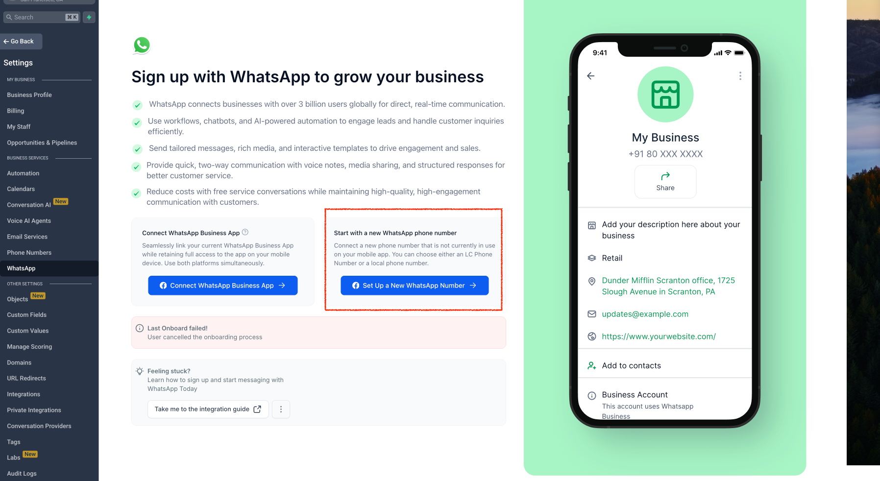• Navigate to Settings > WhatsApp > Set Up a New WhatsApp Number.