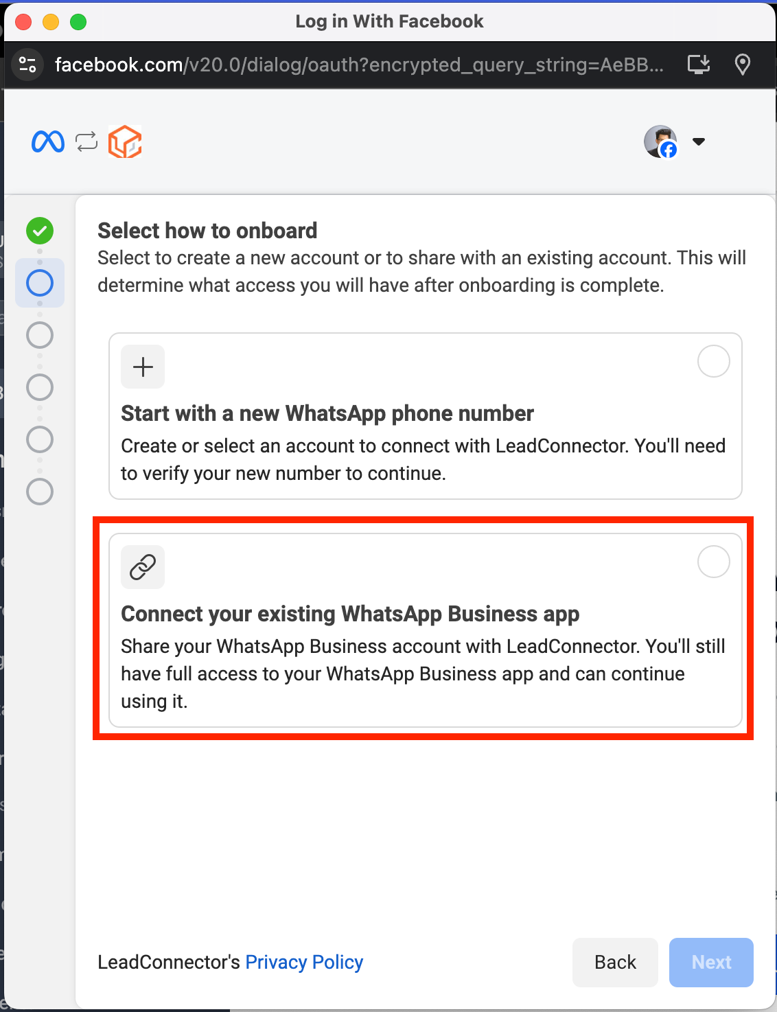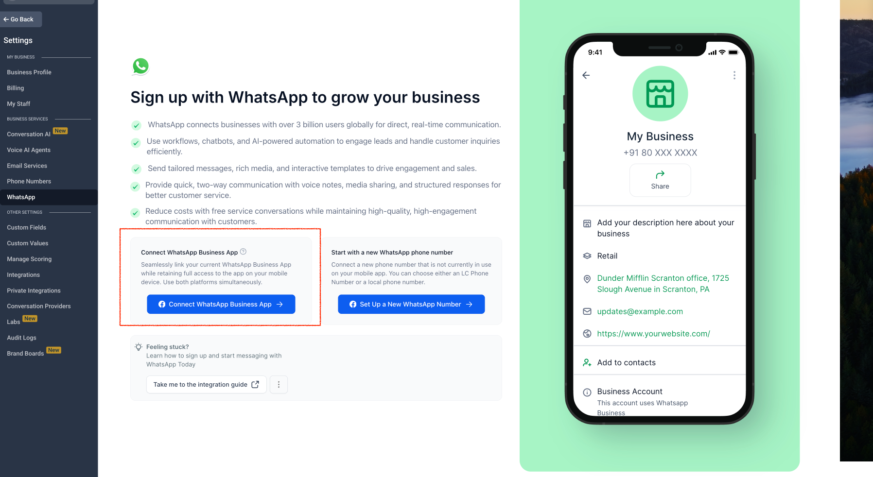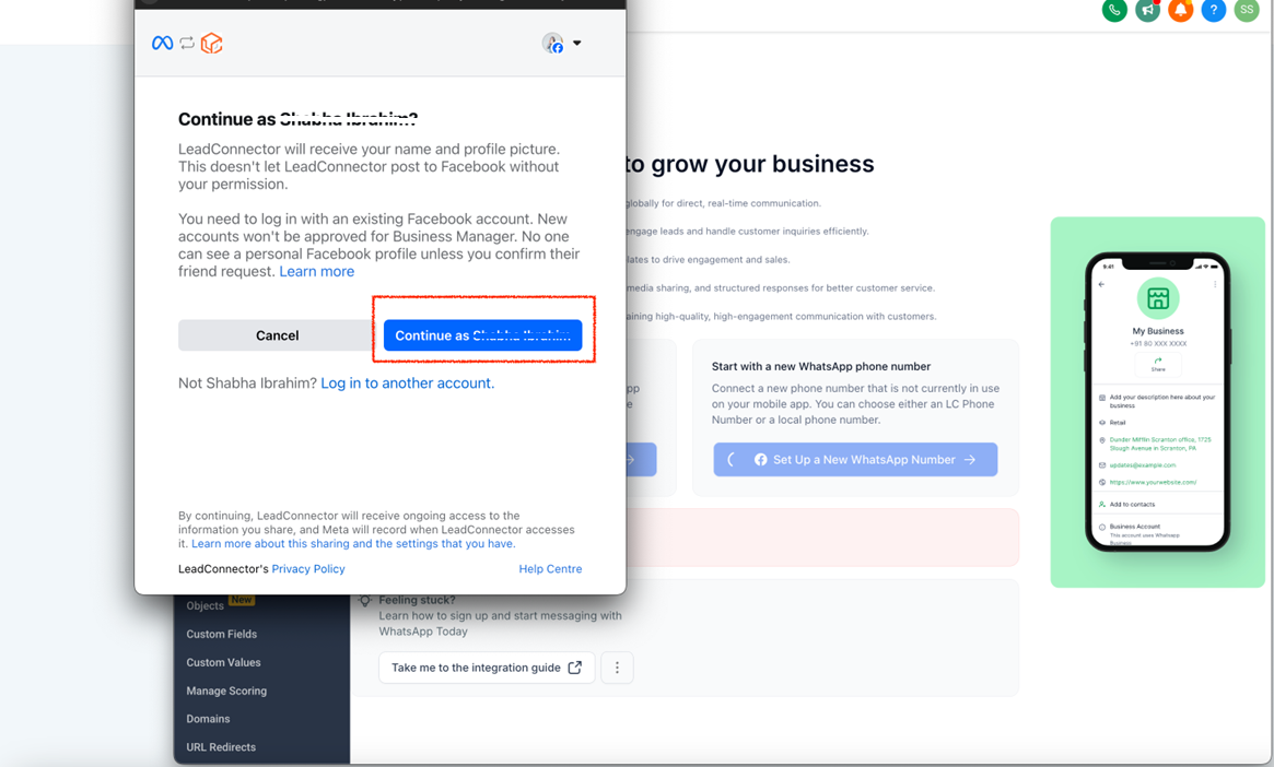 • Share your existing WhatsApp Business account with LeadConnector.