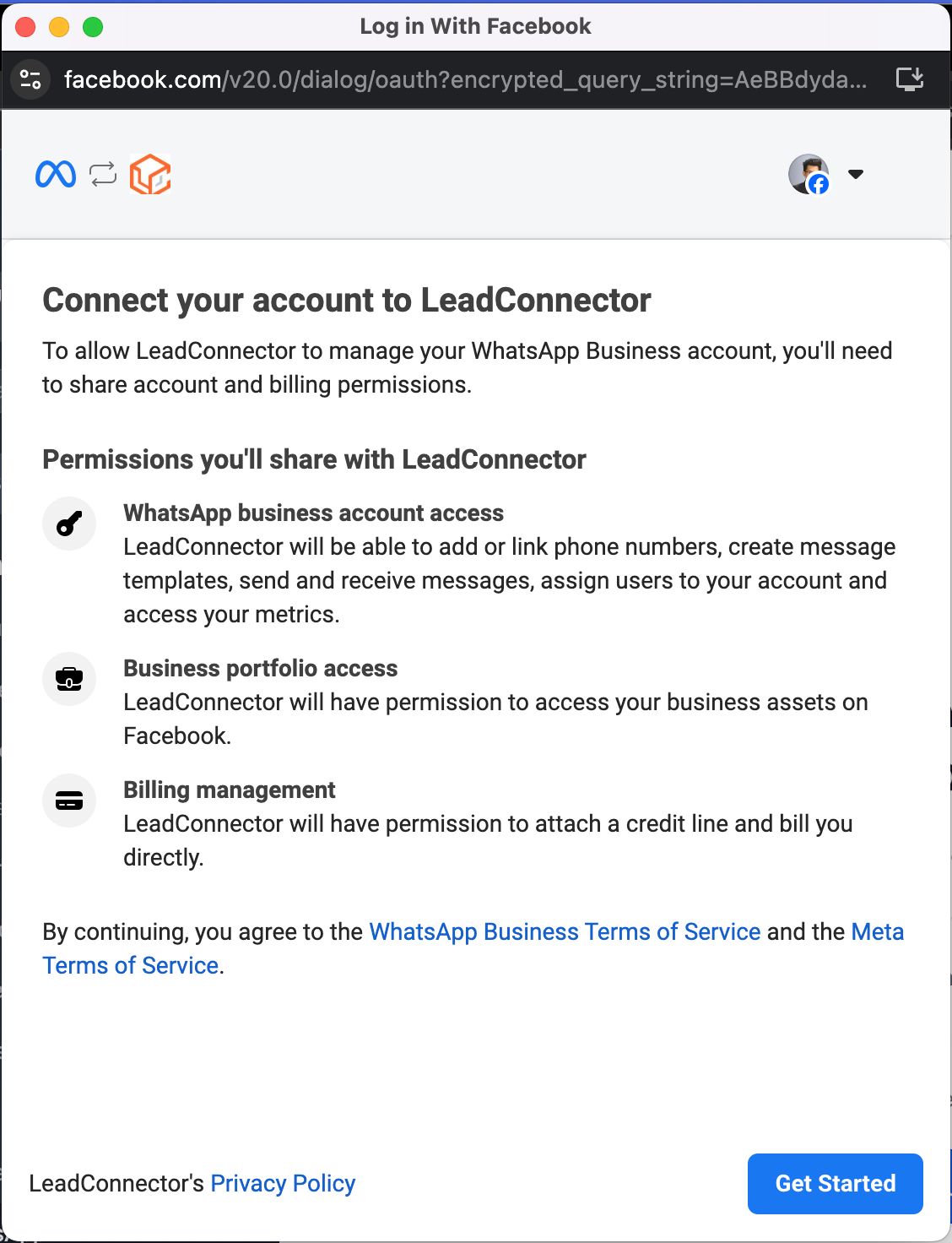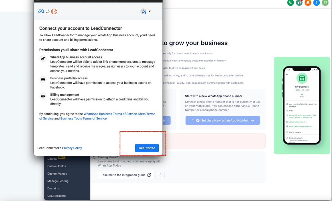 • Click Get Started to link your WhatsApp Business account with LeadConnector.
