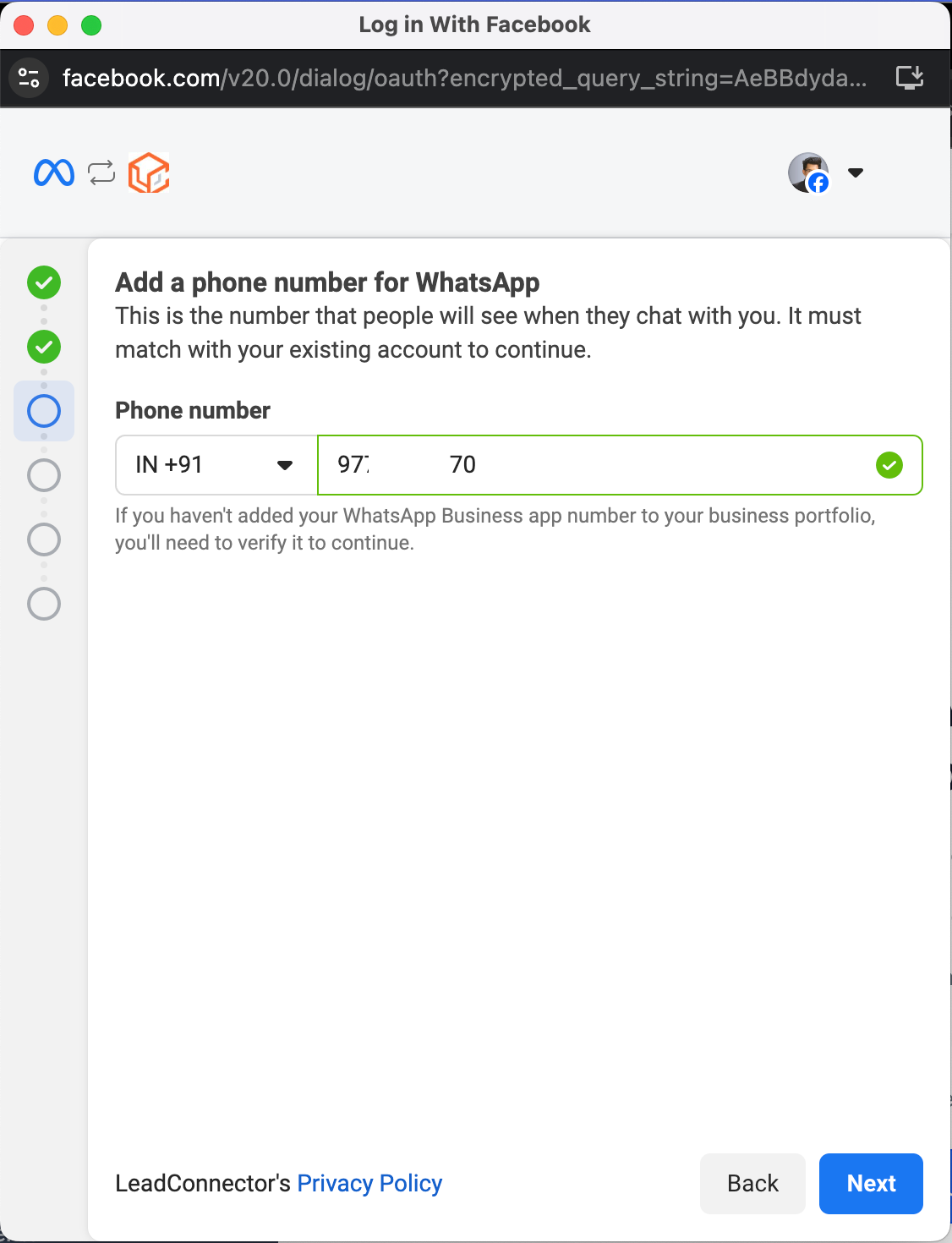 • Enter the WhatsApp number you want to connect.