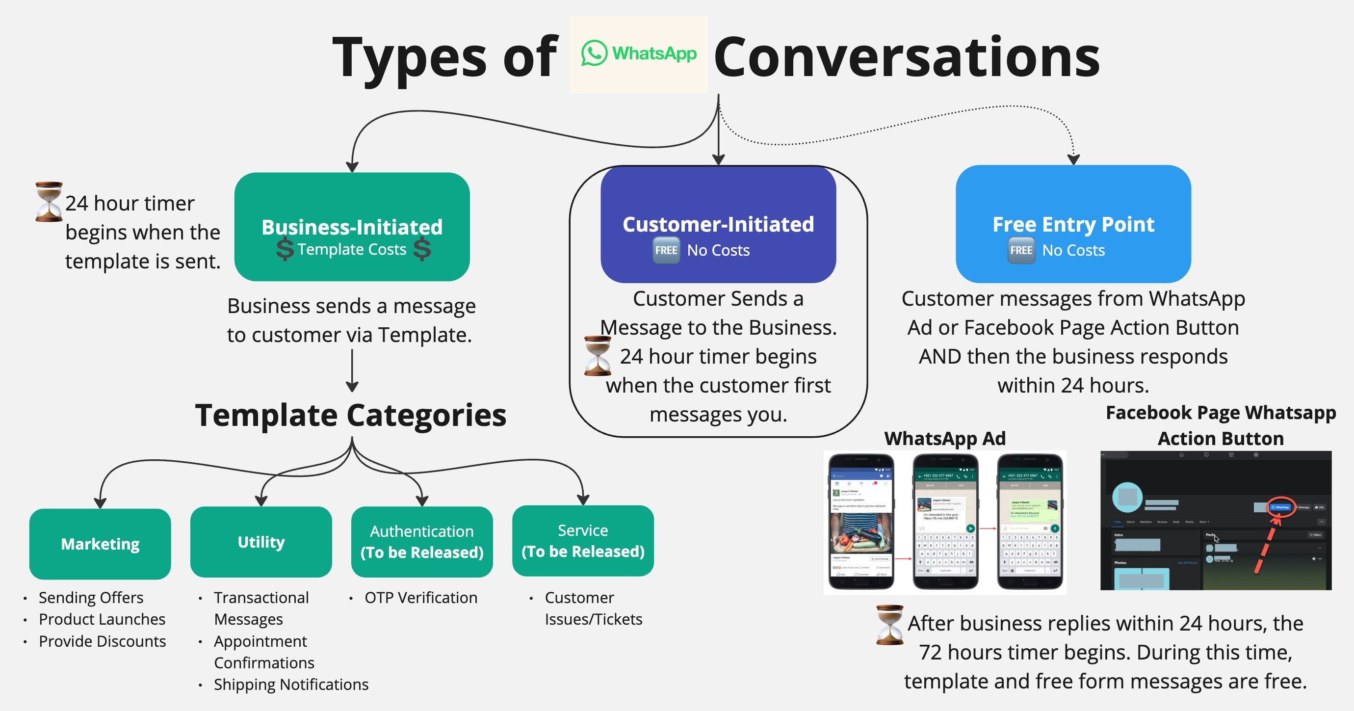 Free Entry Conversations: Initiated when customers interact with a WhatsApp Ad or a Facebook Business Page WhatsApp Action Button, allowing for a 72-hour window for businesses to respond. The business must respond within 24 hours of customer free point entry, after the business responds, the 72-hour timer begins.