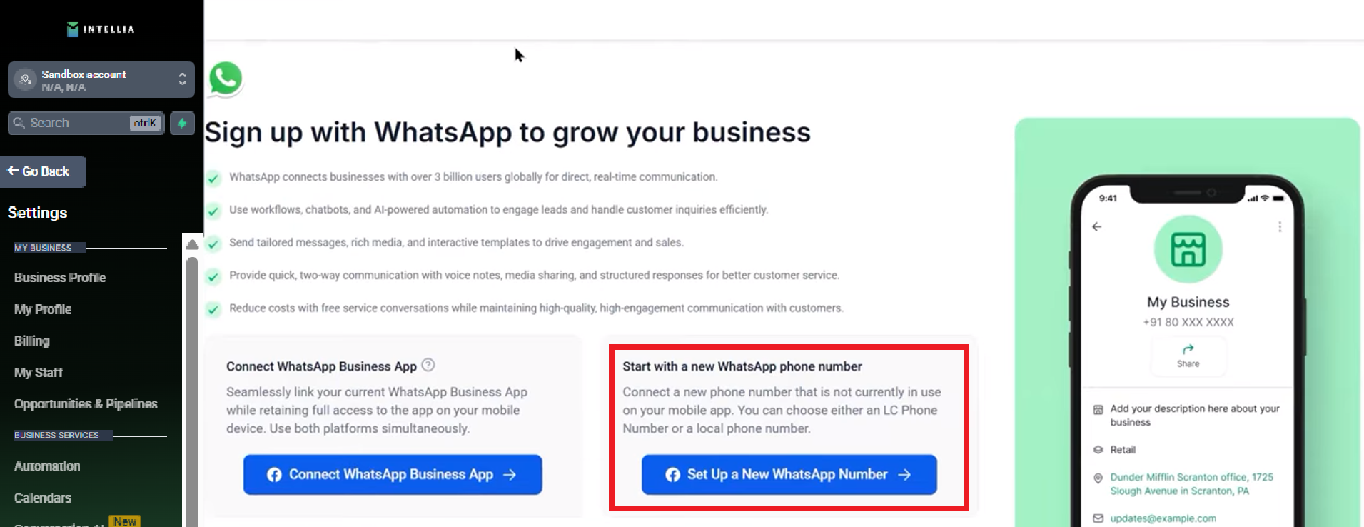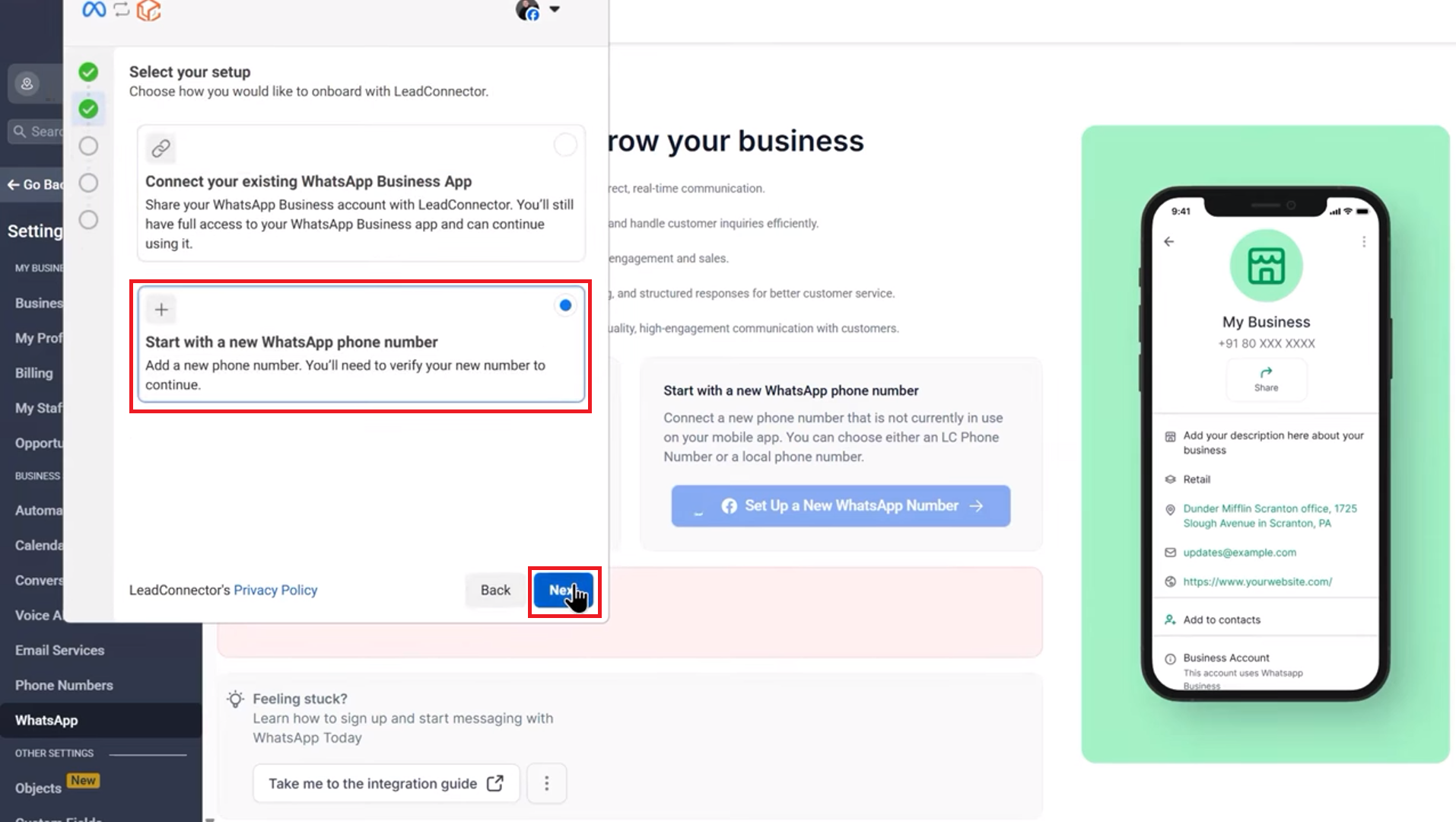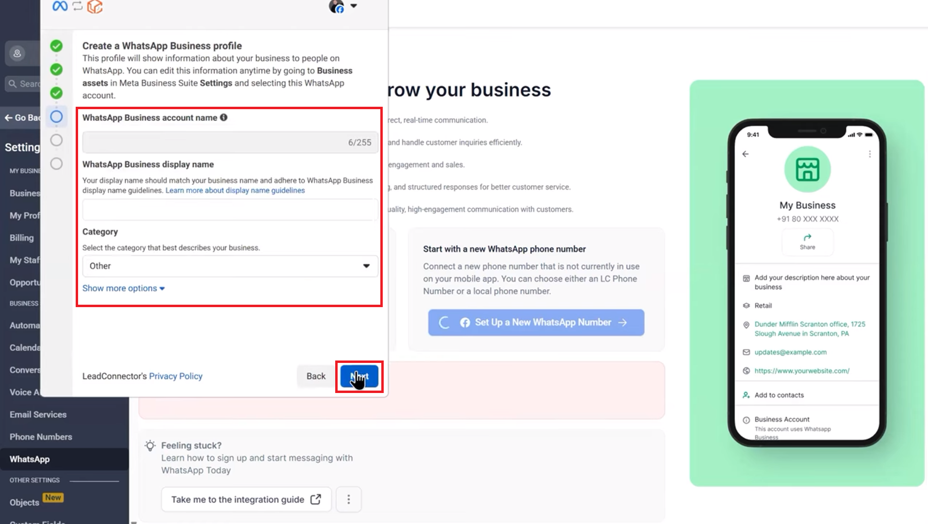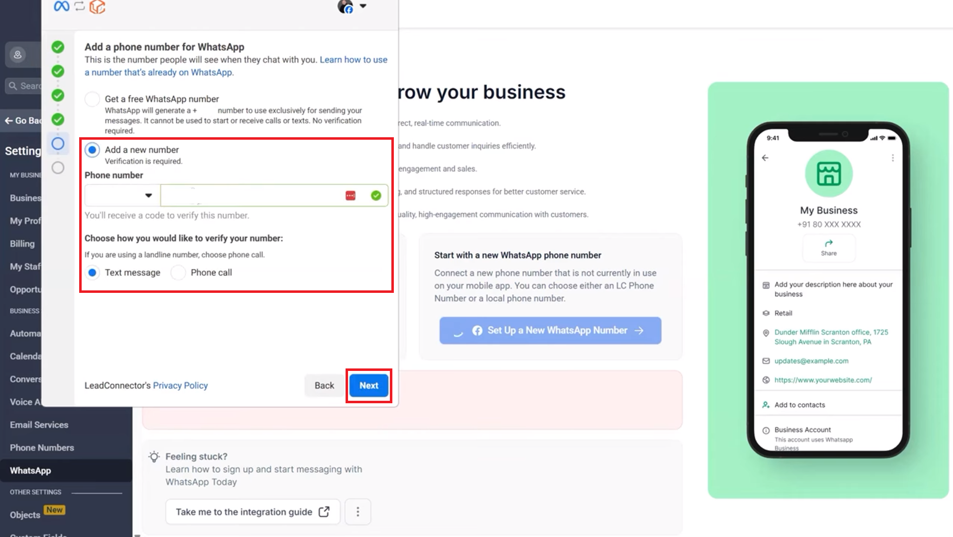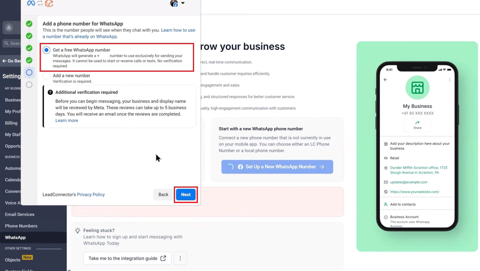 Add a phone number for WhatsApp. Choose between Get a free WhatsApp number, or
