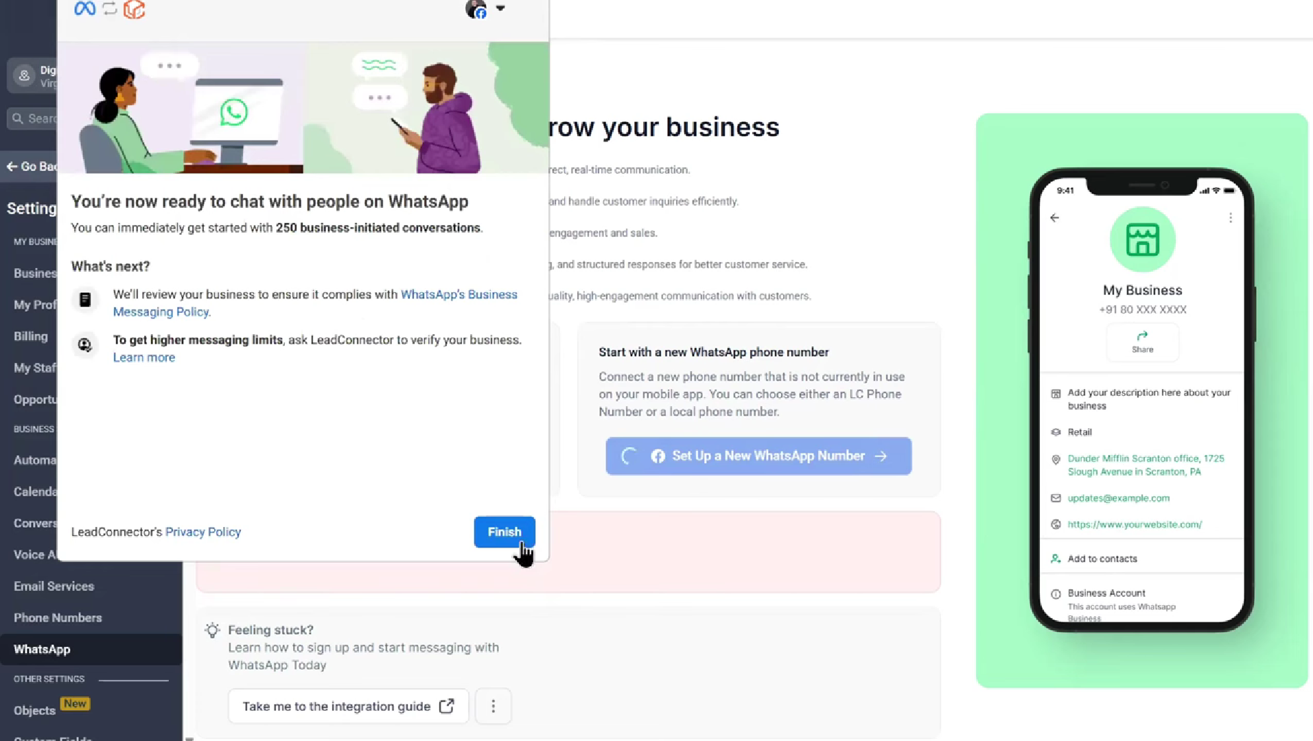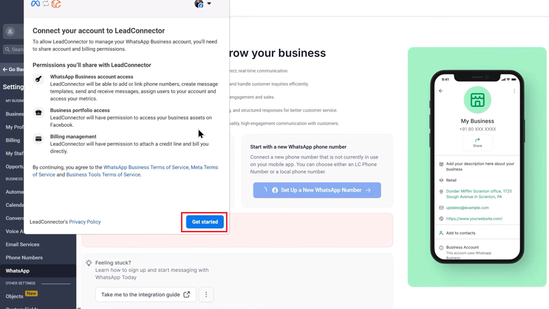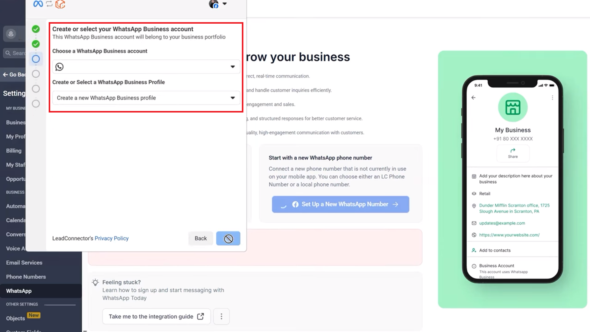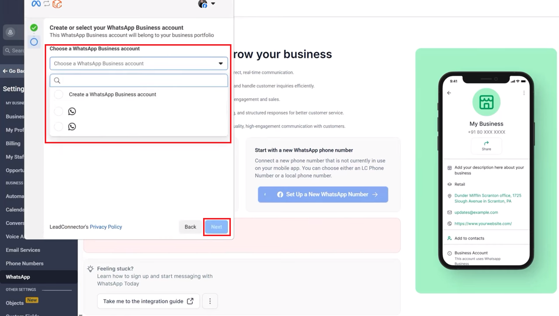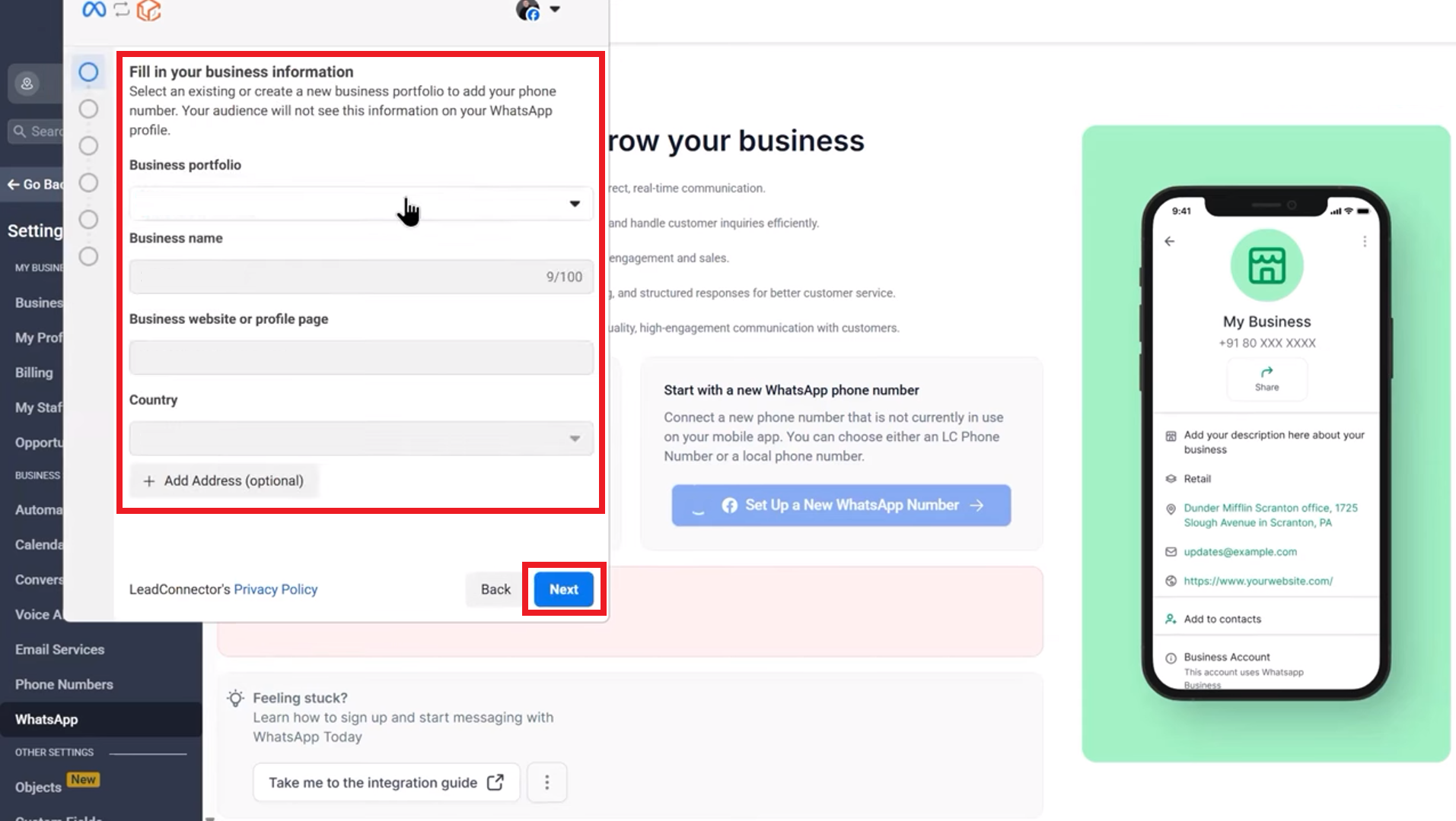 Add a phone number for WhatsApp. Choose between Get a free WhatsApp number, or