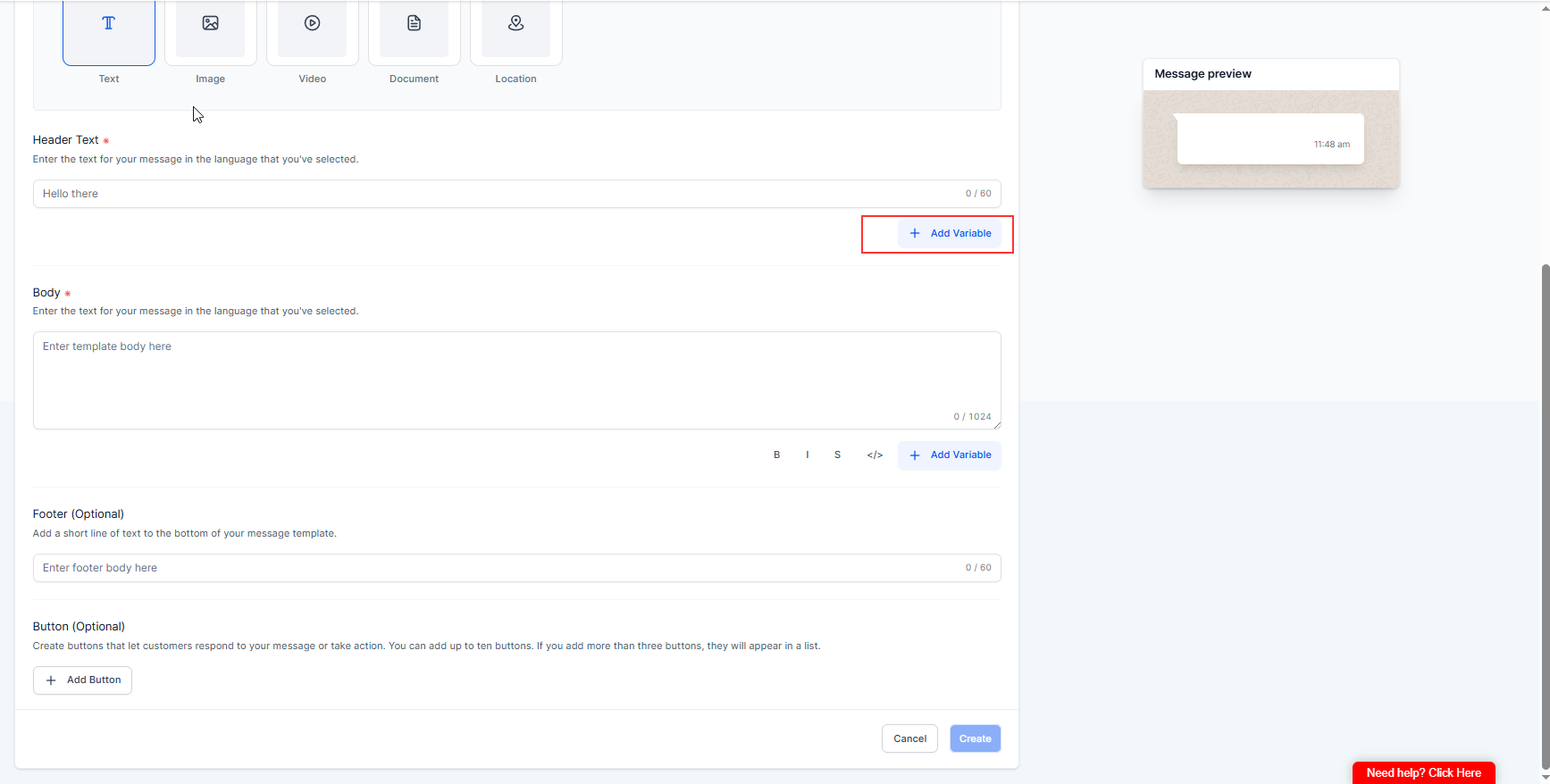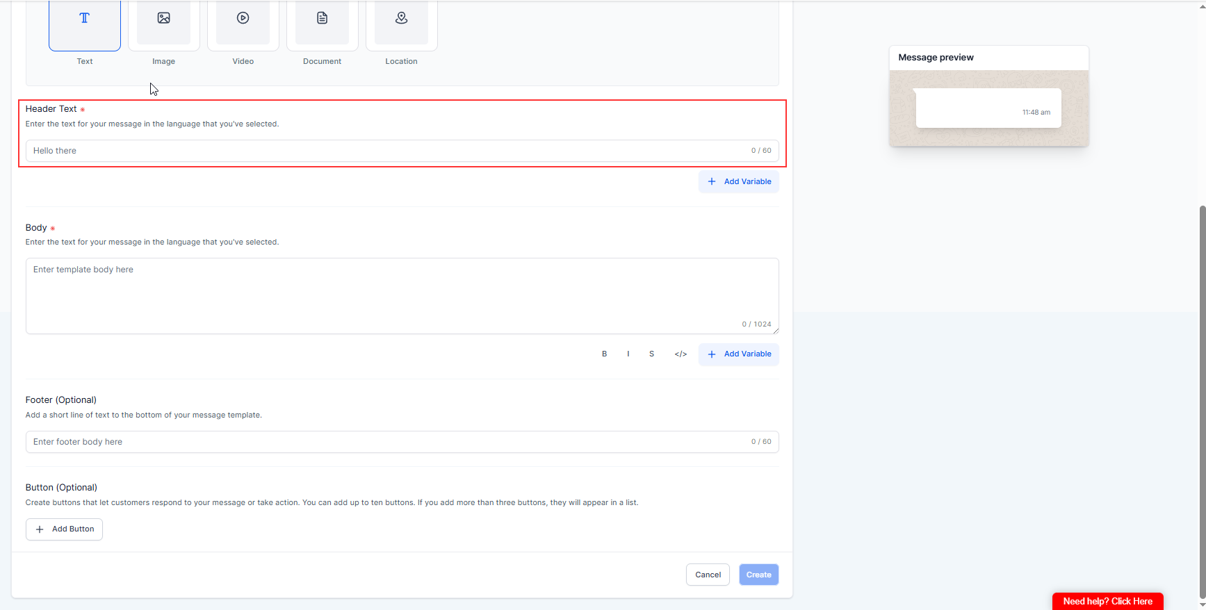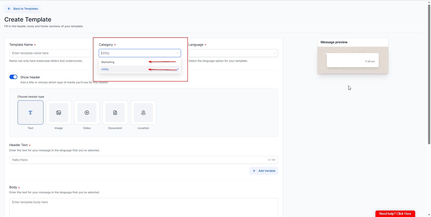 Choose Template Category (IMPORTANT): You must choose one Marketing or Utility