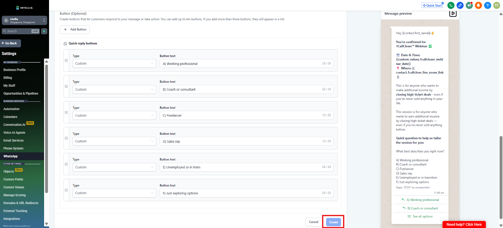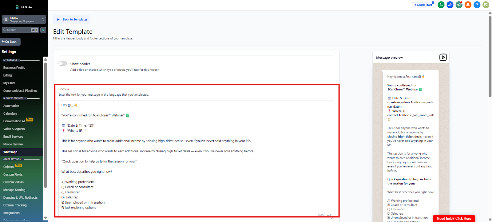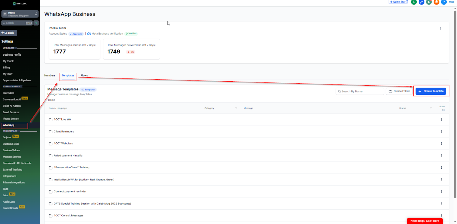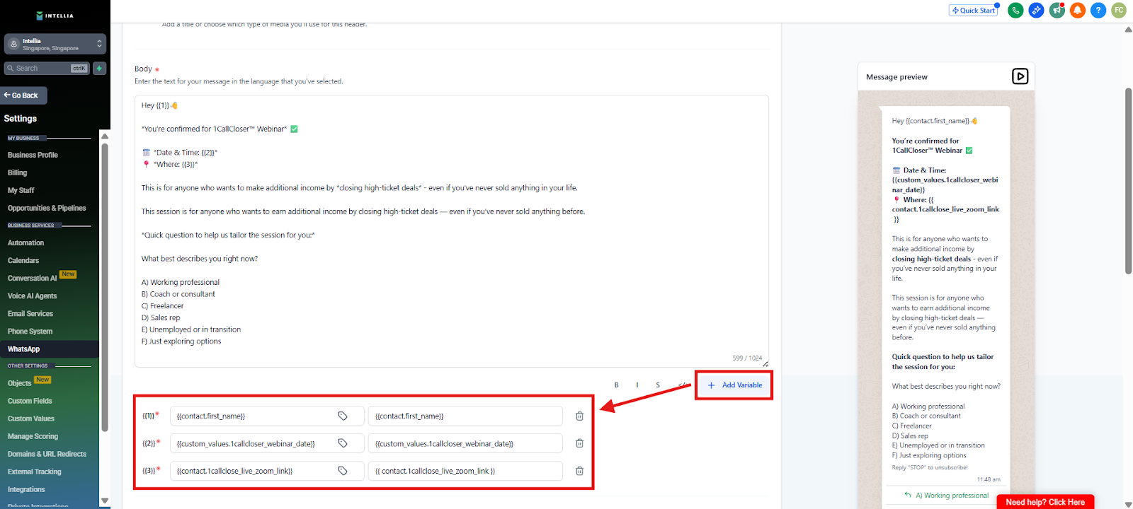 This step ensures your messages are approved by Meta and formatted correctly for Intellia automation.