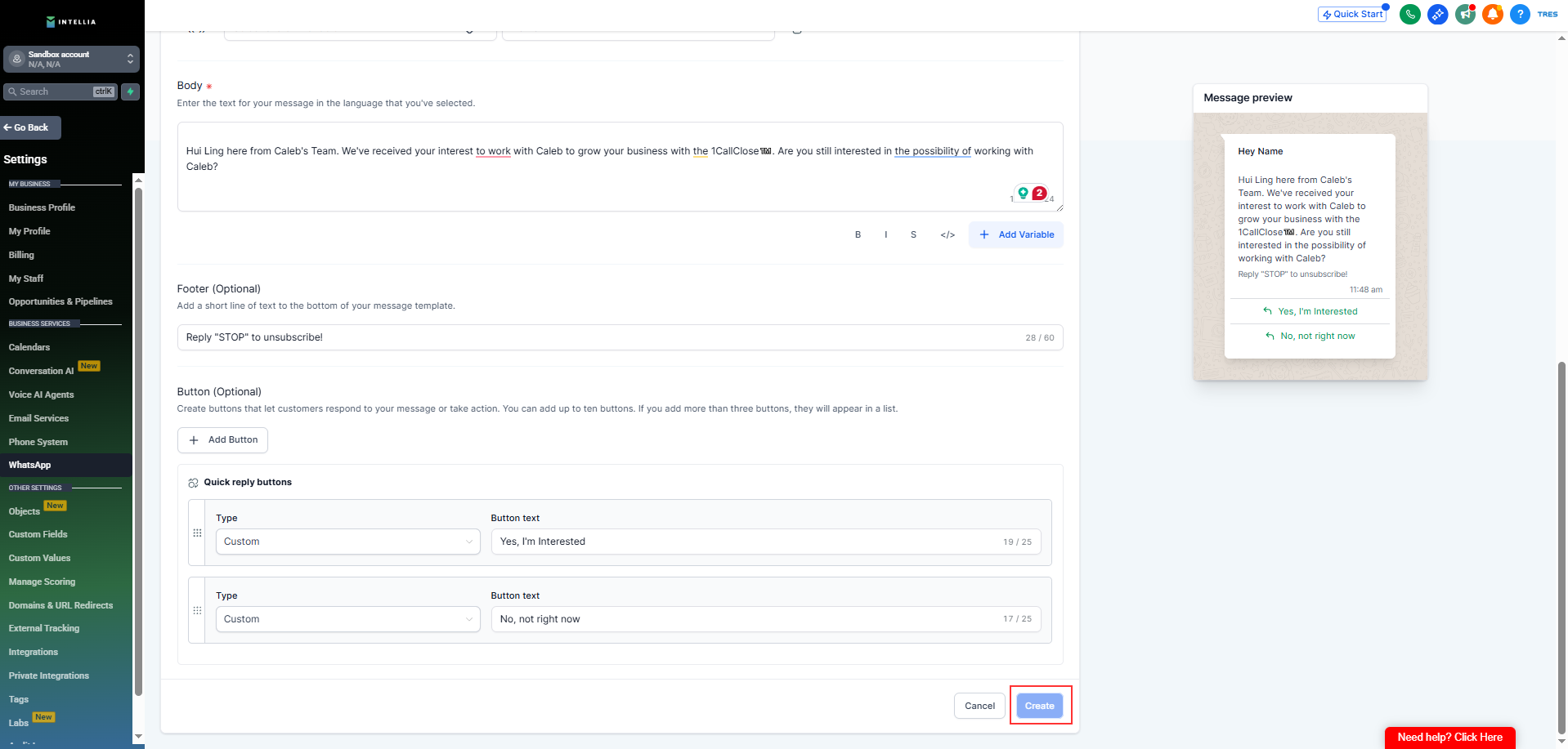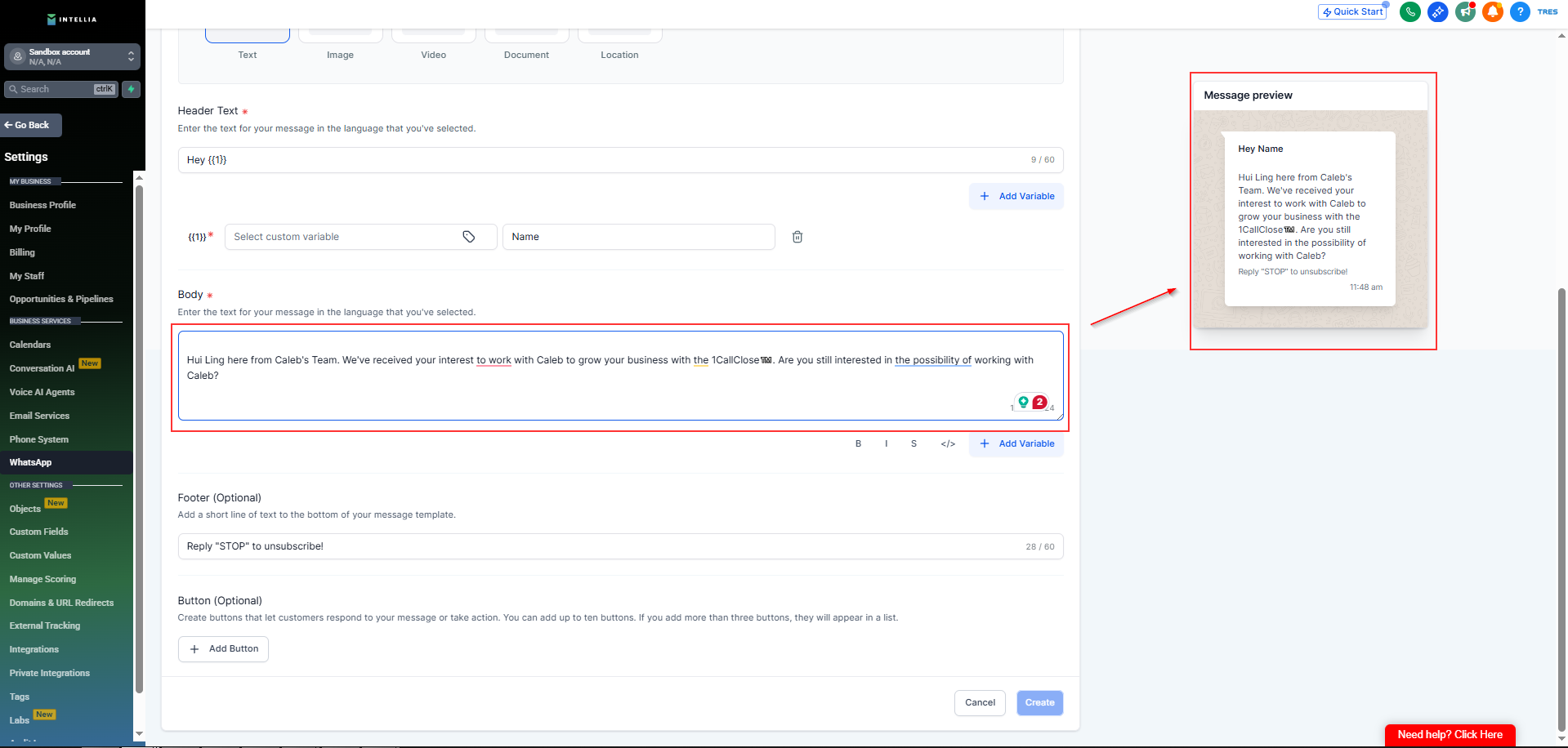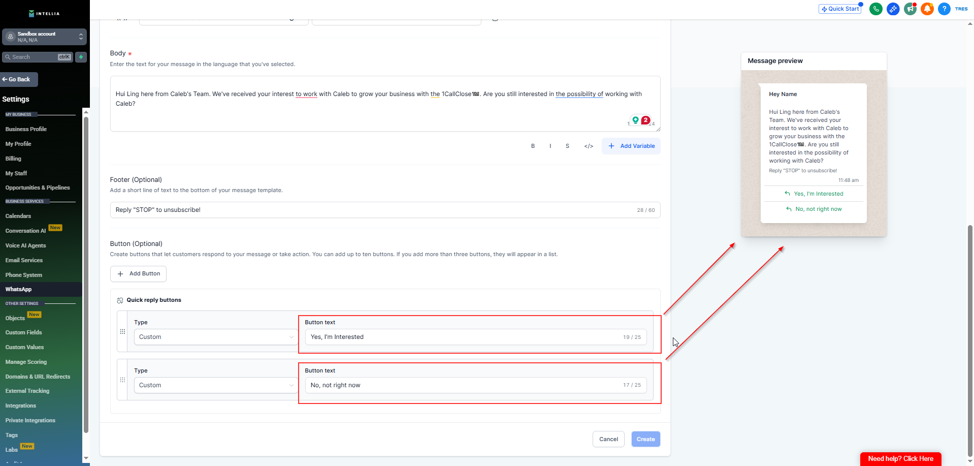 This step ensures your messages are approved by Meta and formatted correctly for Intellia automation.