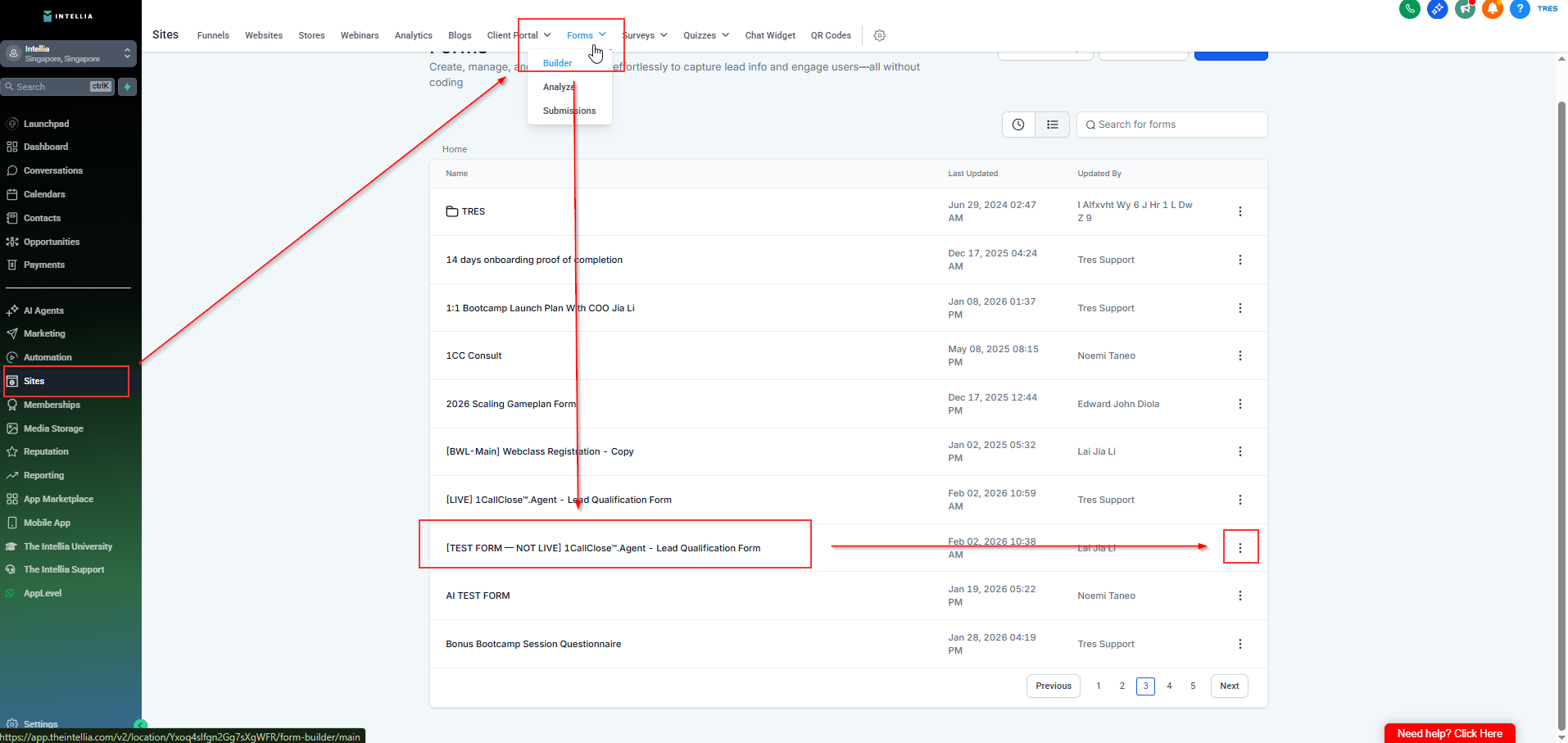 Go to Sites> Form builder > find the test form