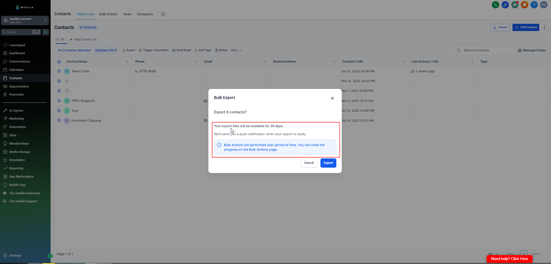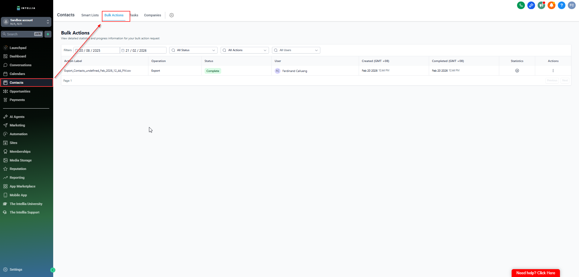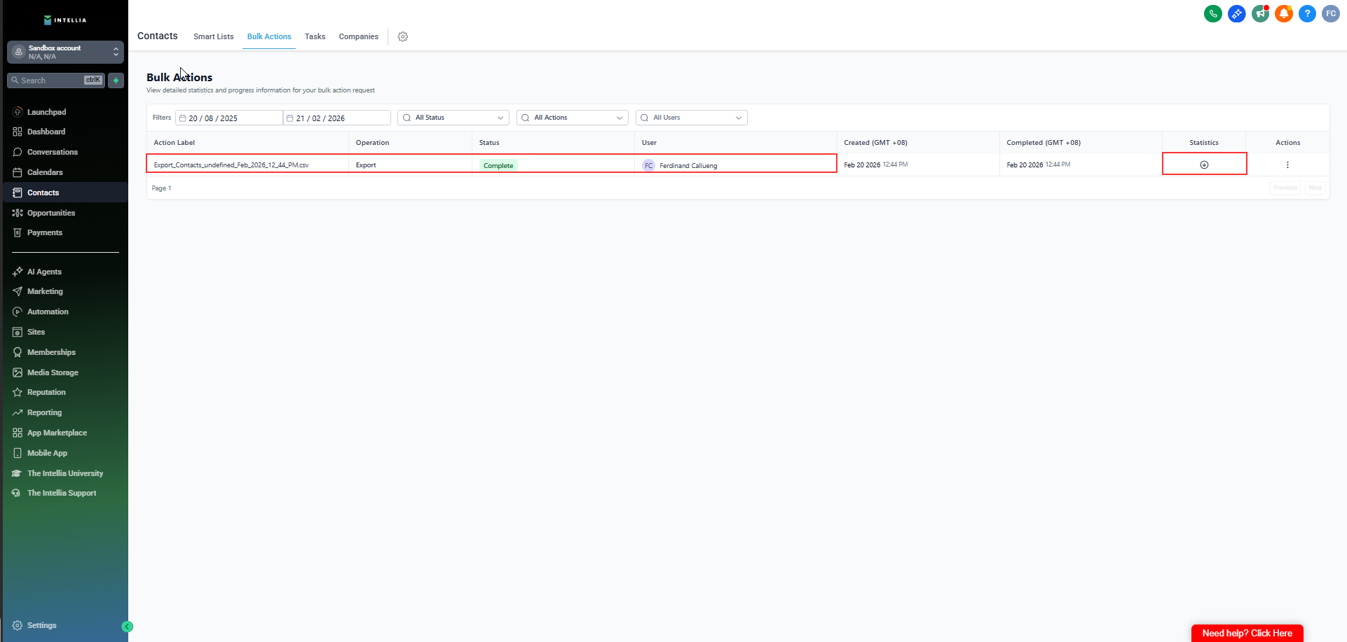 Only Agency Admins and Location Admins can download completed exports from Bulk Actions.