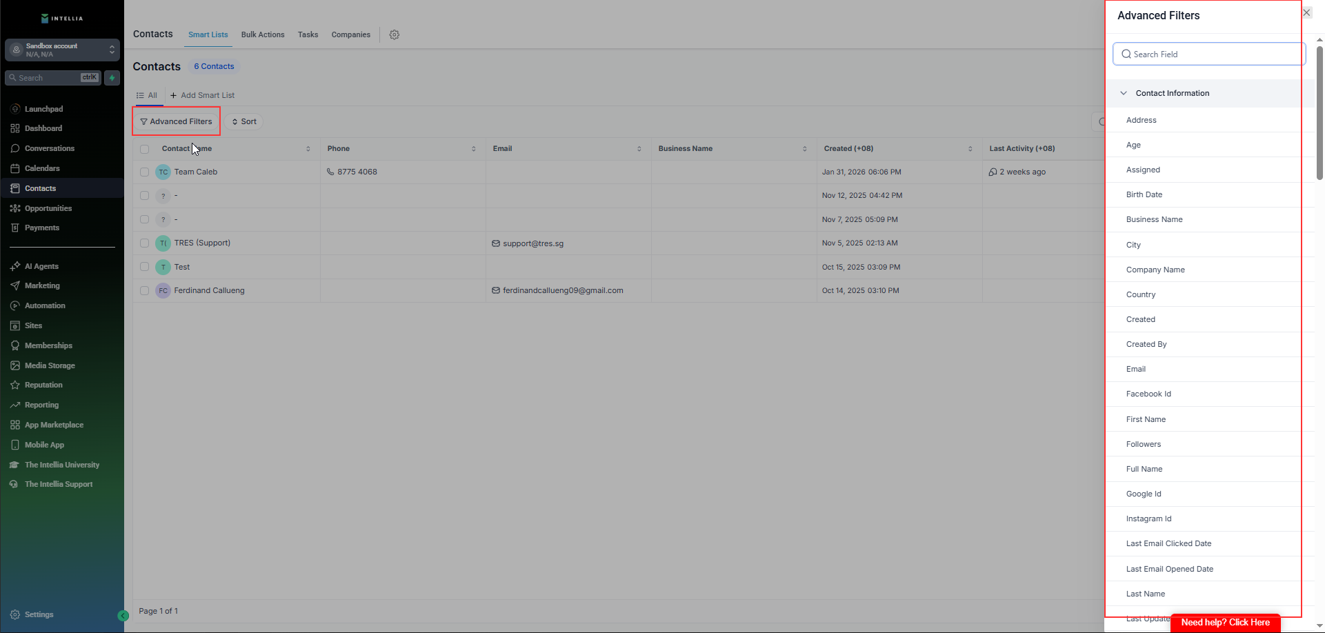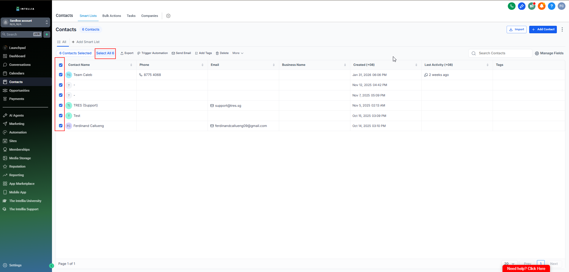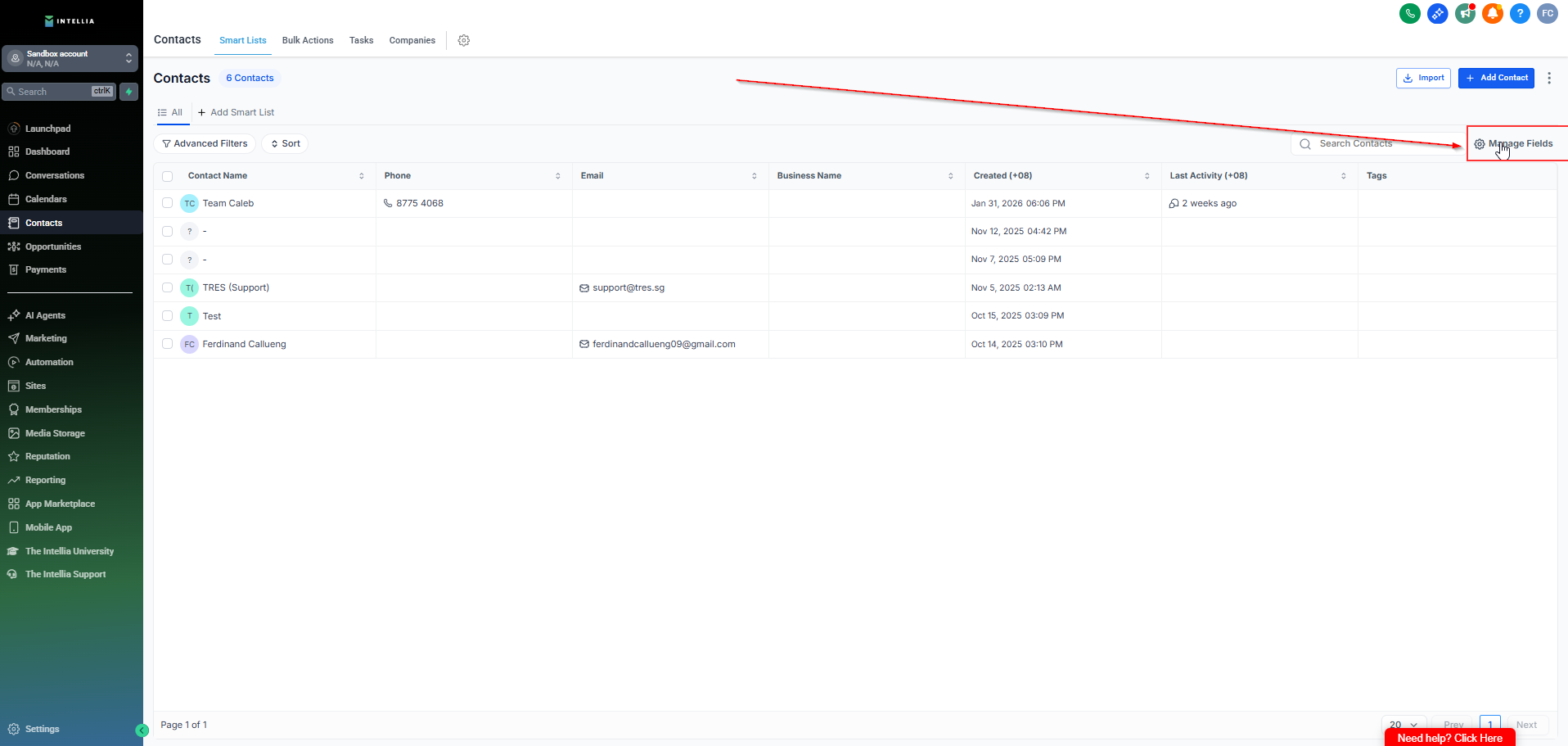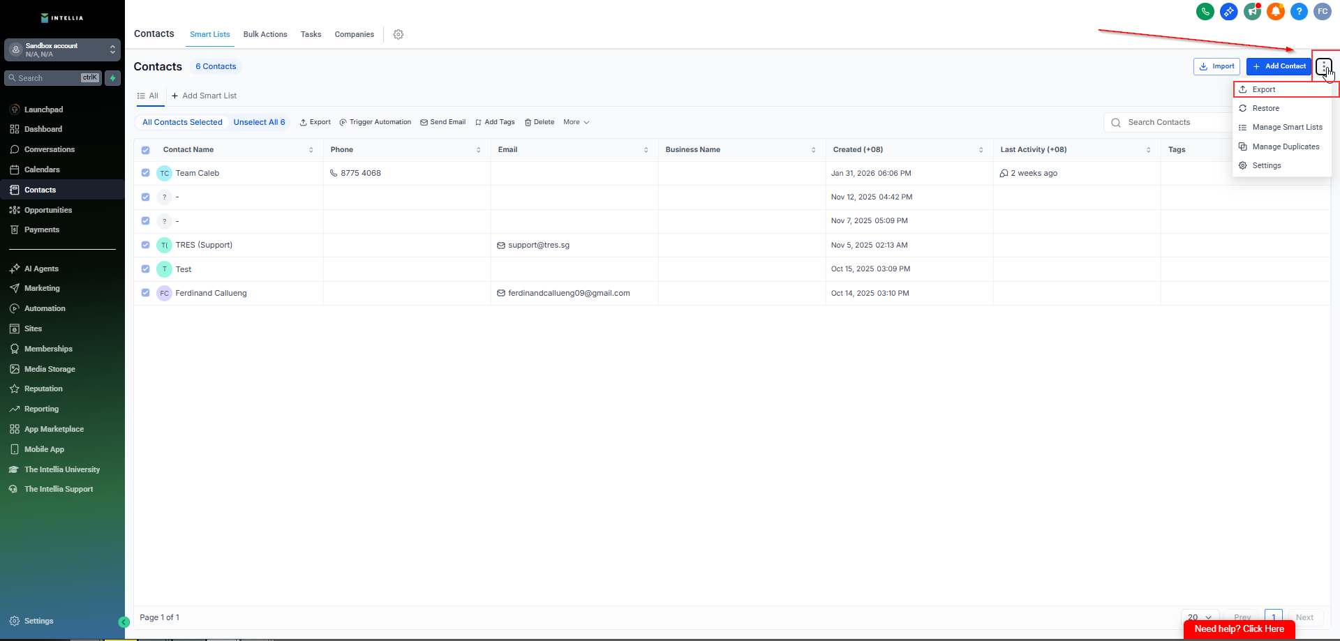 In your Intellia sub-account (location), go to Contacts.
