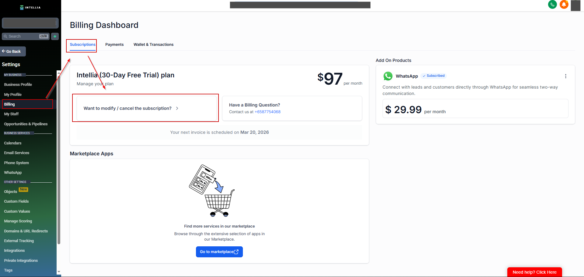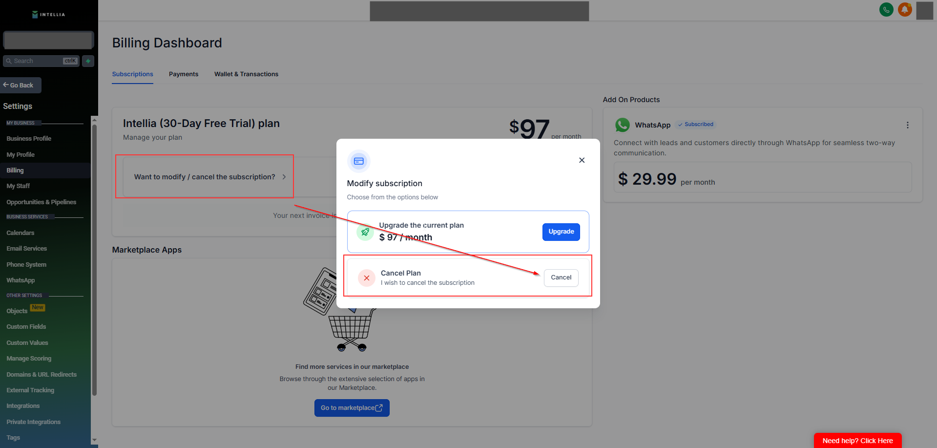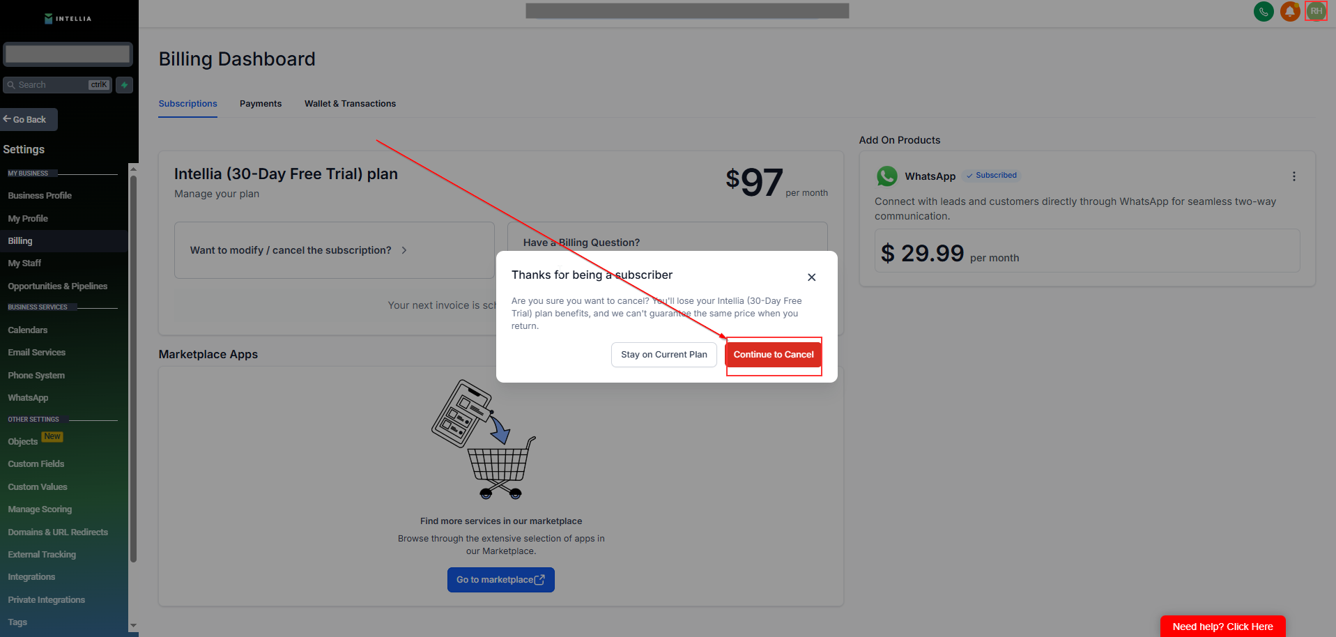 Inside Settings, click Billing from the left menu.