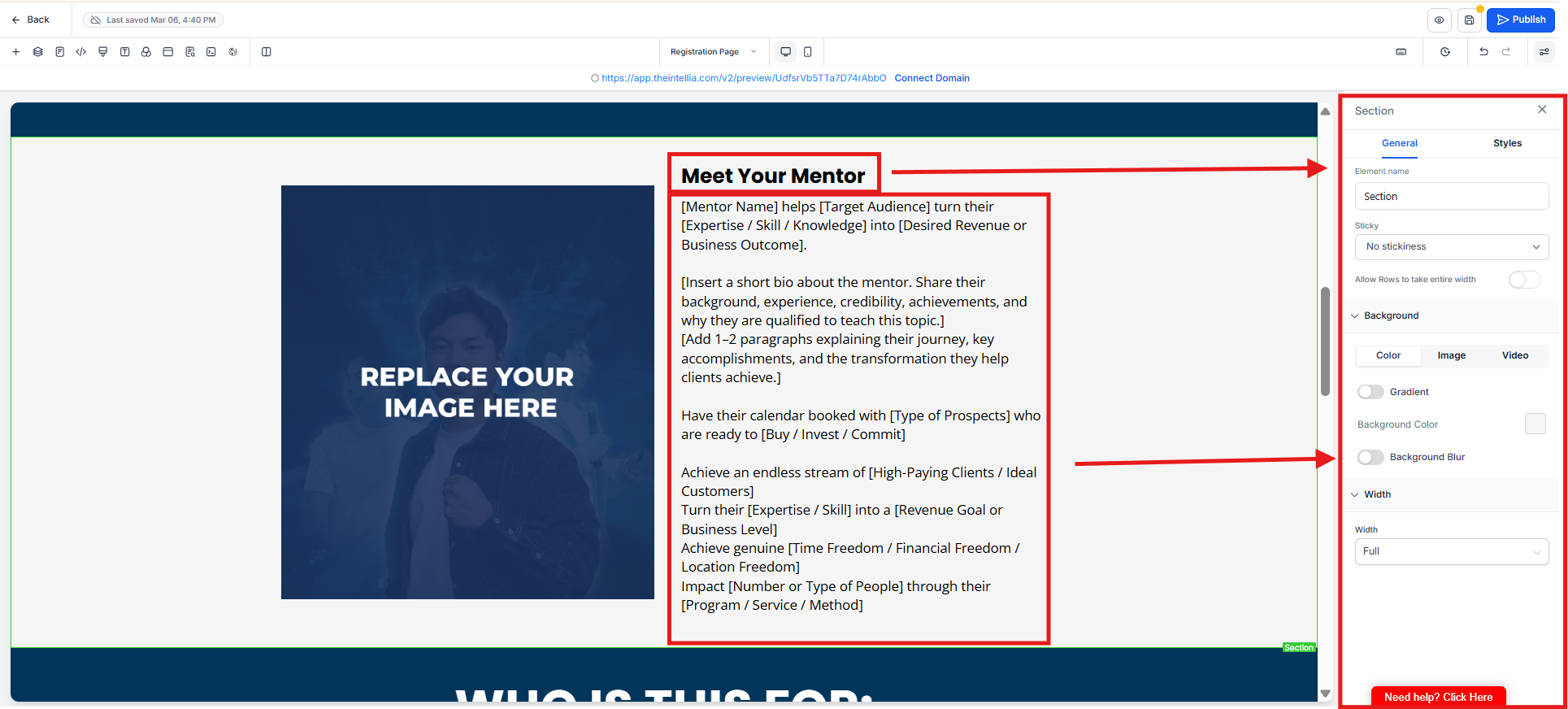 Edit the mentor section with the correct name, introduction, credentials, and short bio.