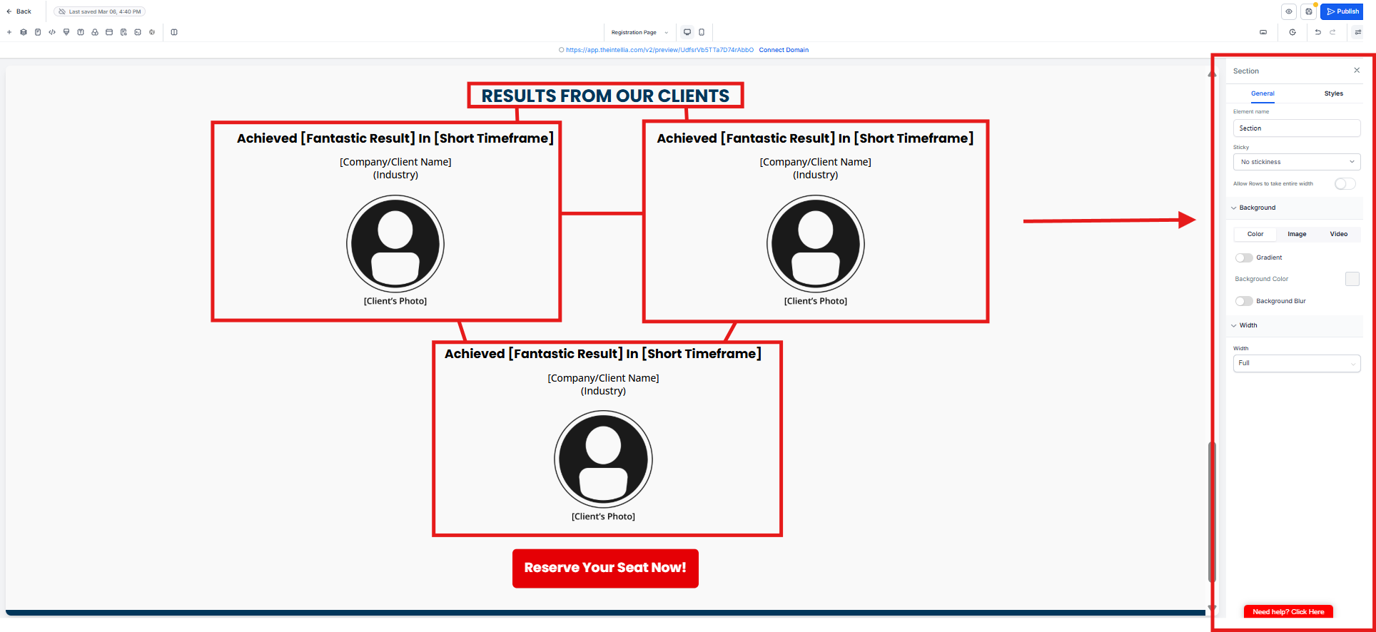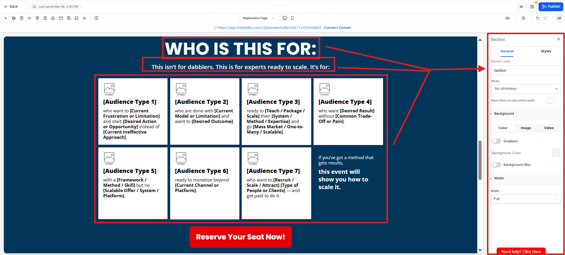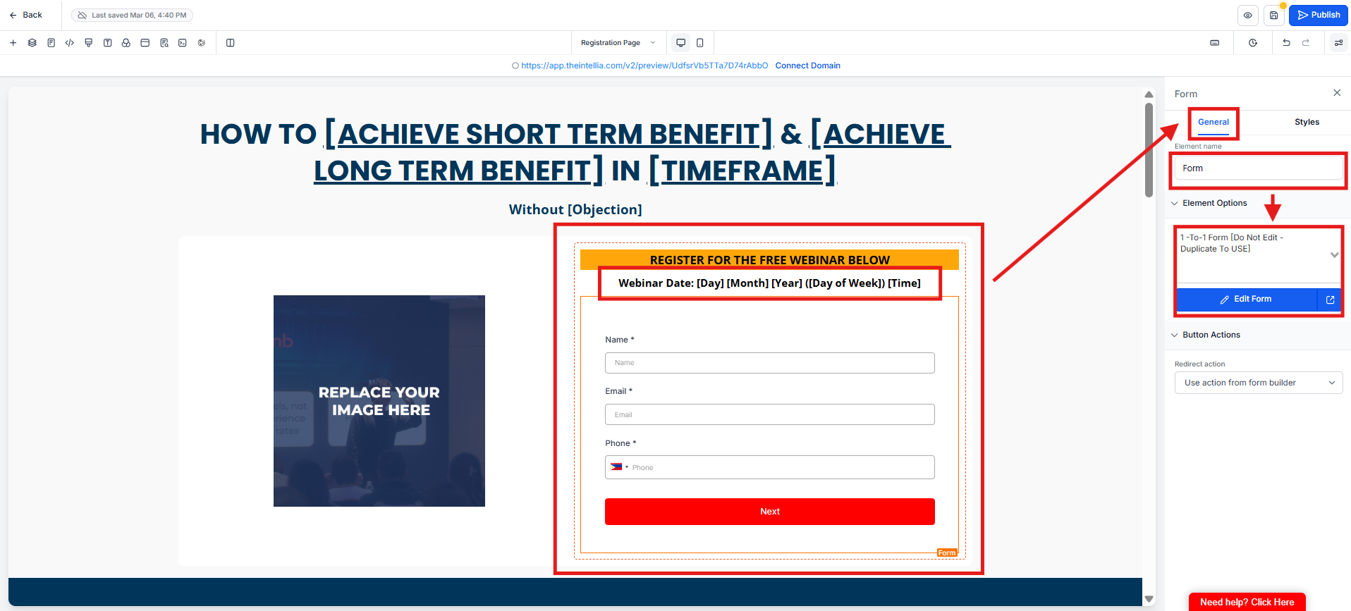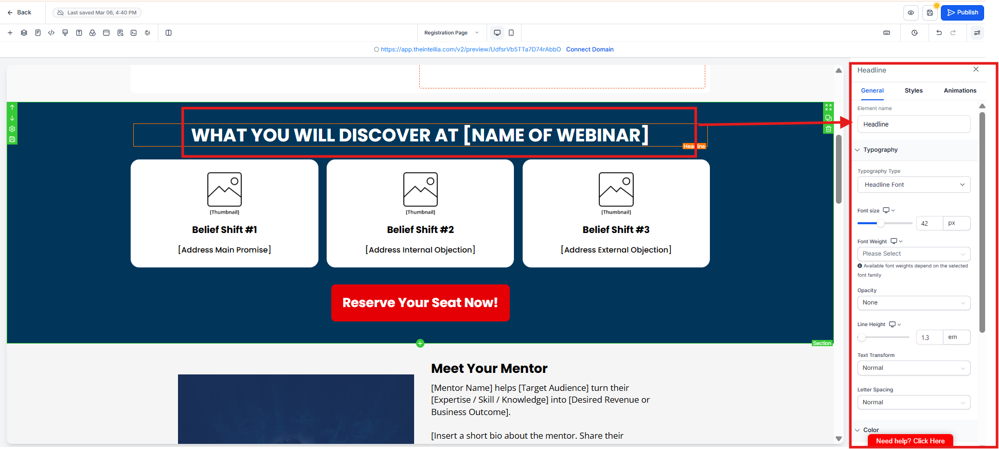 You need to update the webinar date, webinar name, mentor details, target audience section, client results section, and CTA button link.