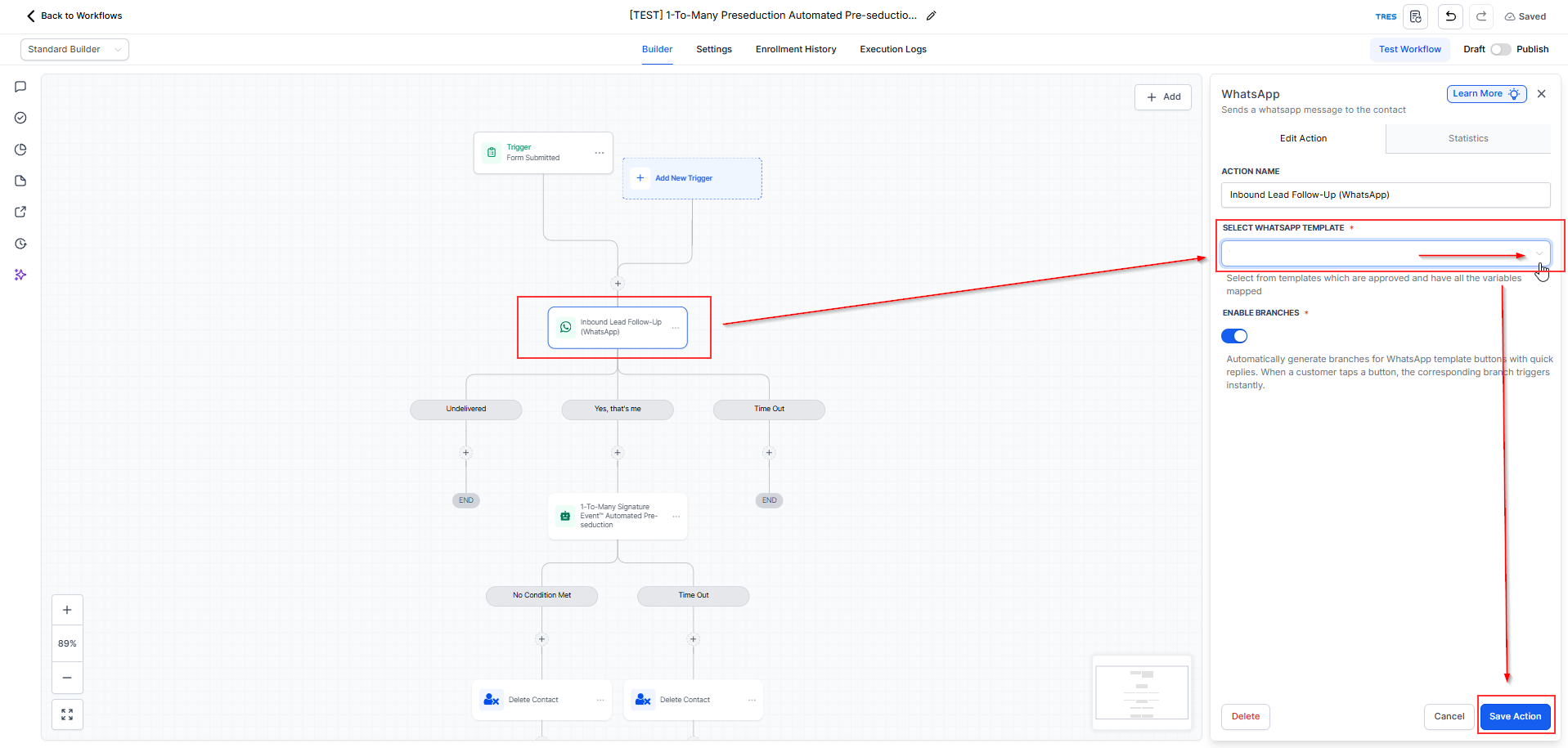 Complete this step only after your initial WhatsApp message template has been approved. If the template is still pending or rejected, it will not be available for selection inside the workflow.