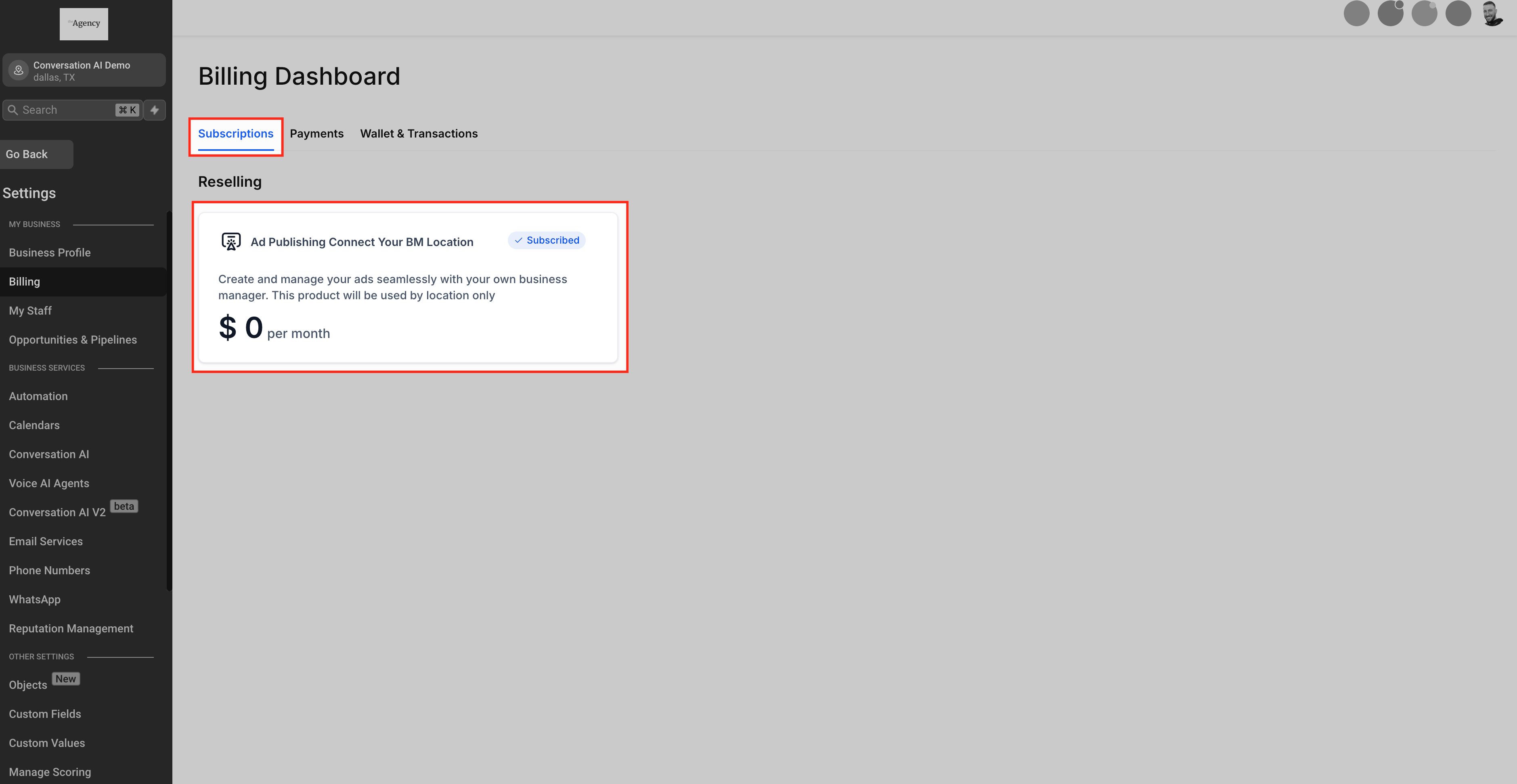 In the Billing section, you can oversee all active subscriptions associated with the sub-account, including: