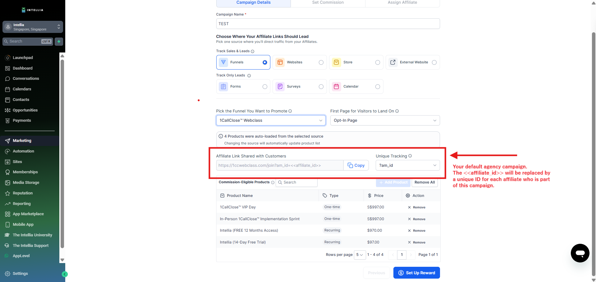 You can also choose the landing page where potential customers will land. Once set, the system will generate a default campaign URL. This URL includes a unique affiliate link, where the placeholder <<affiliate_id>> is automatically replaced with each affiliate's unique ID.