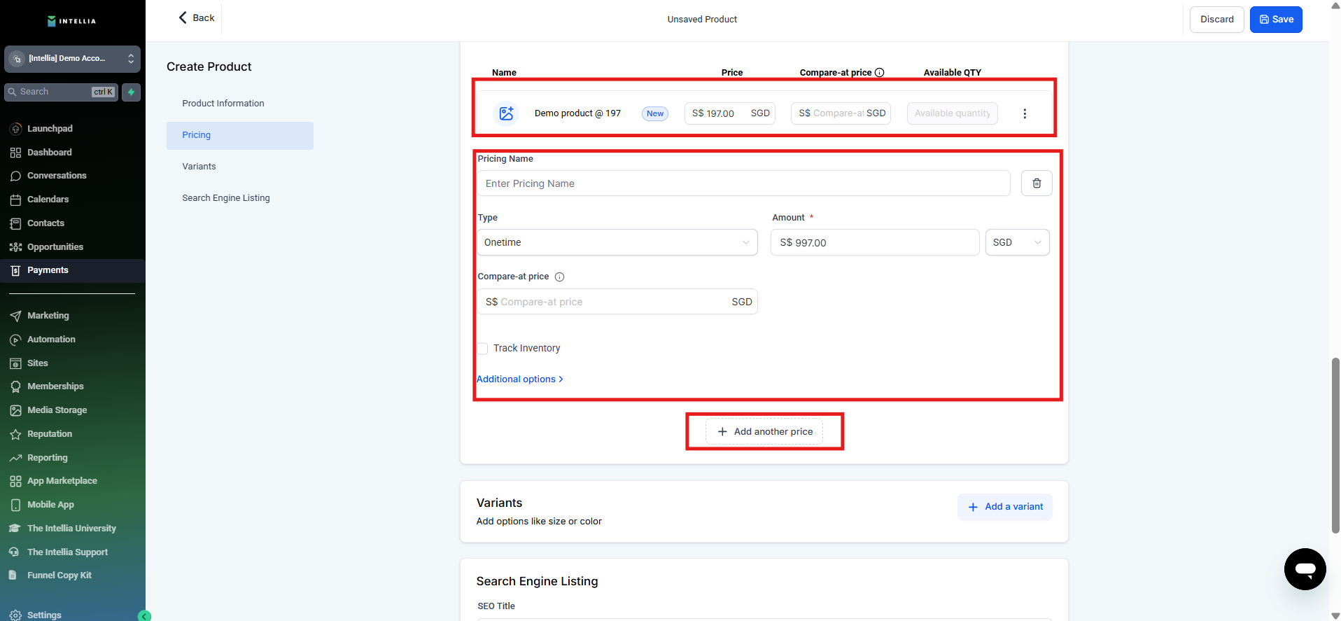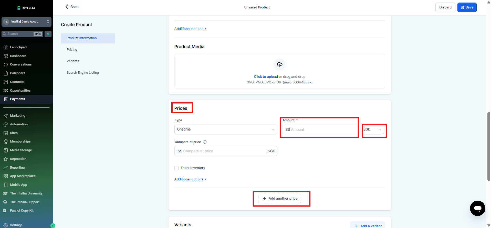 Step 3 : Under the Prices > put your desire Amount for your Offer Product > and make sure the currency is SGD > And for the Bump Products > click the"+ Add another price" > for Additional Price Product.