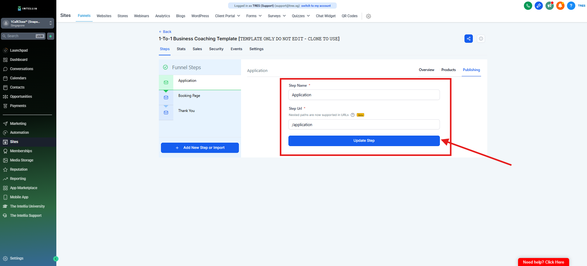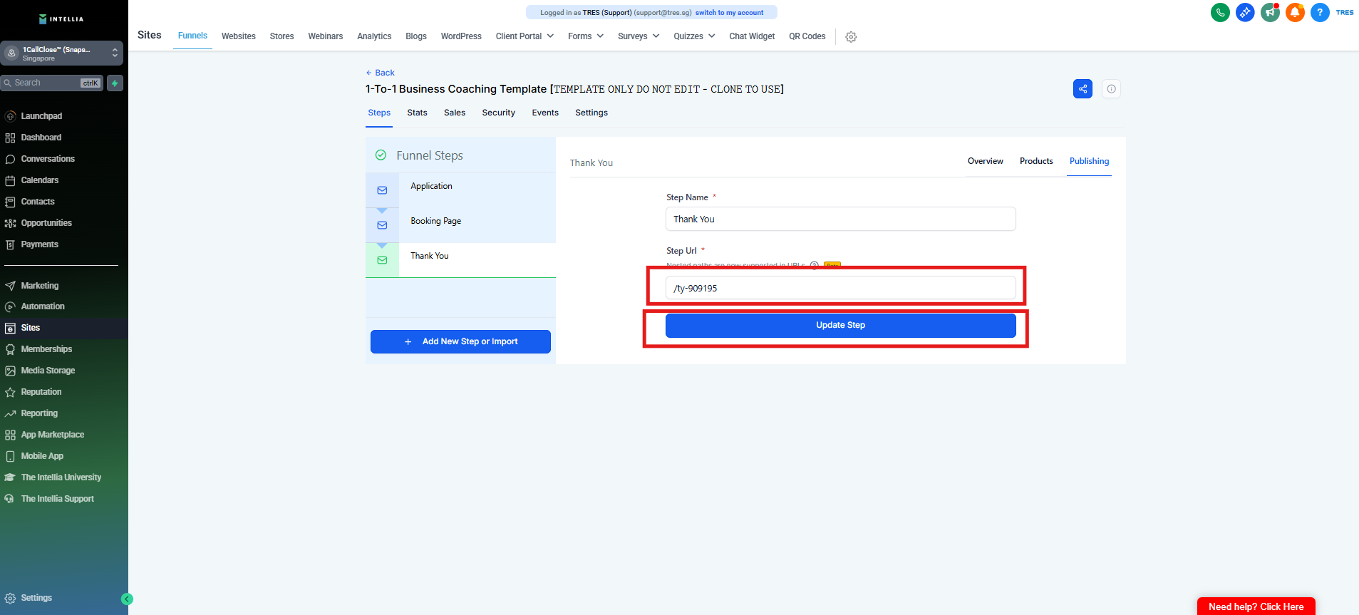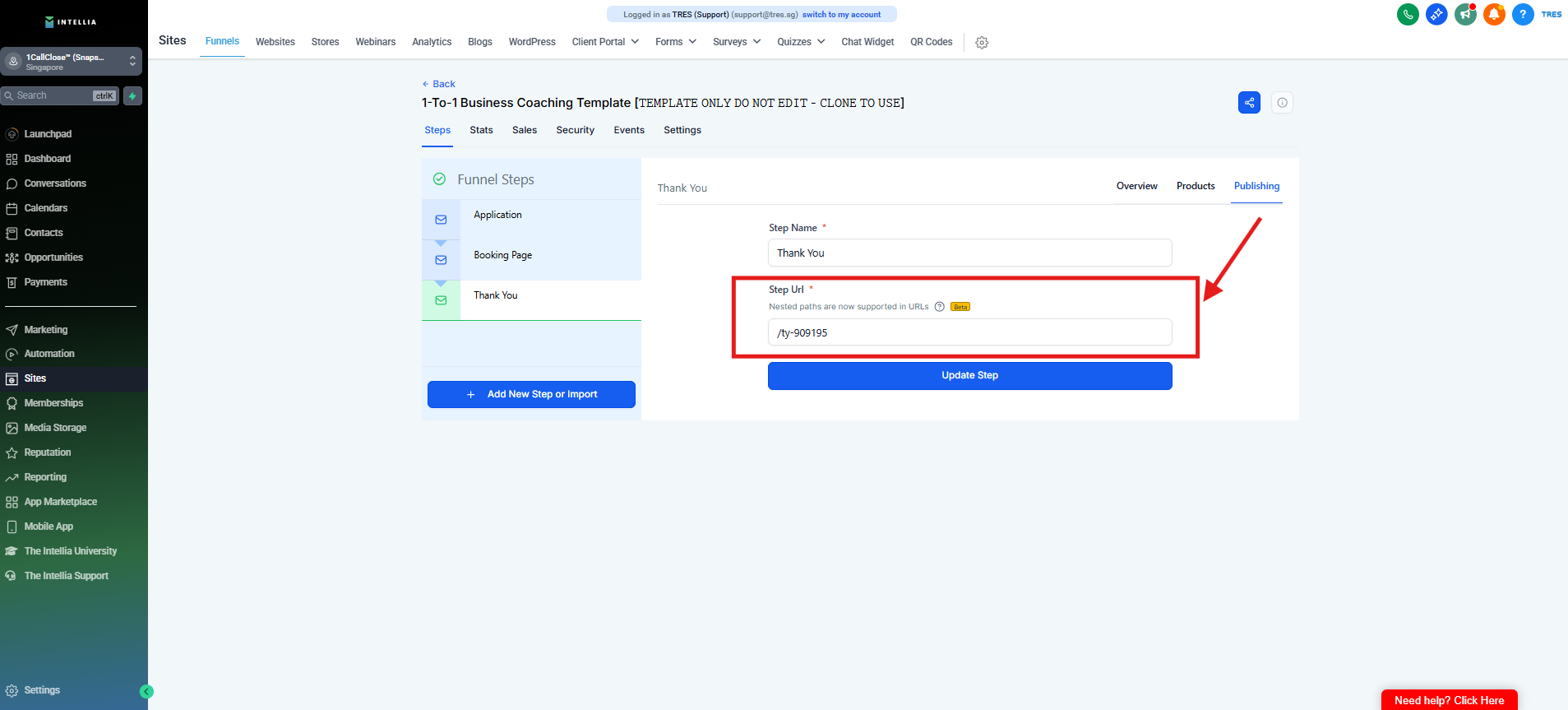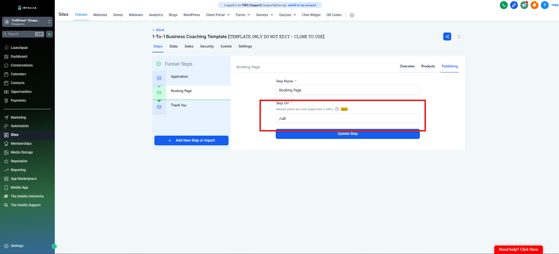 Step 9 : Enter "/fb" for the consultation funnel and "/join" for the webinar funnel, then click "Update Step" to save.