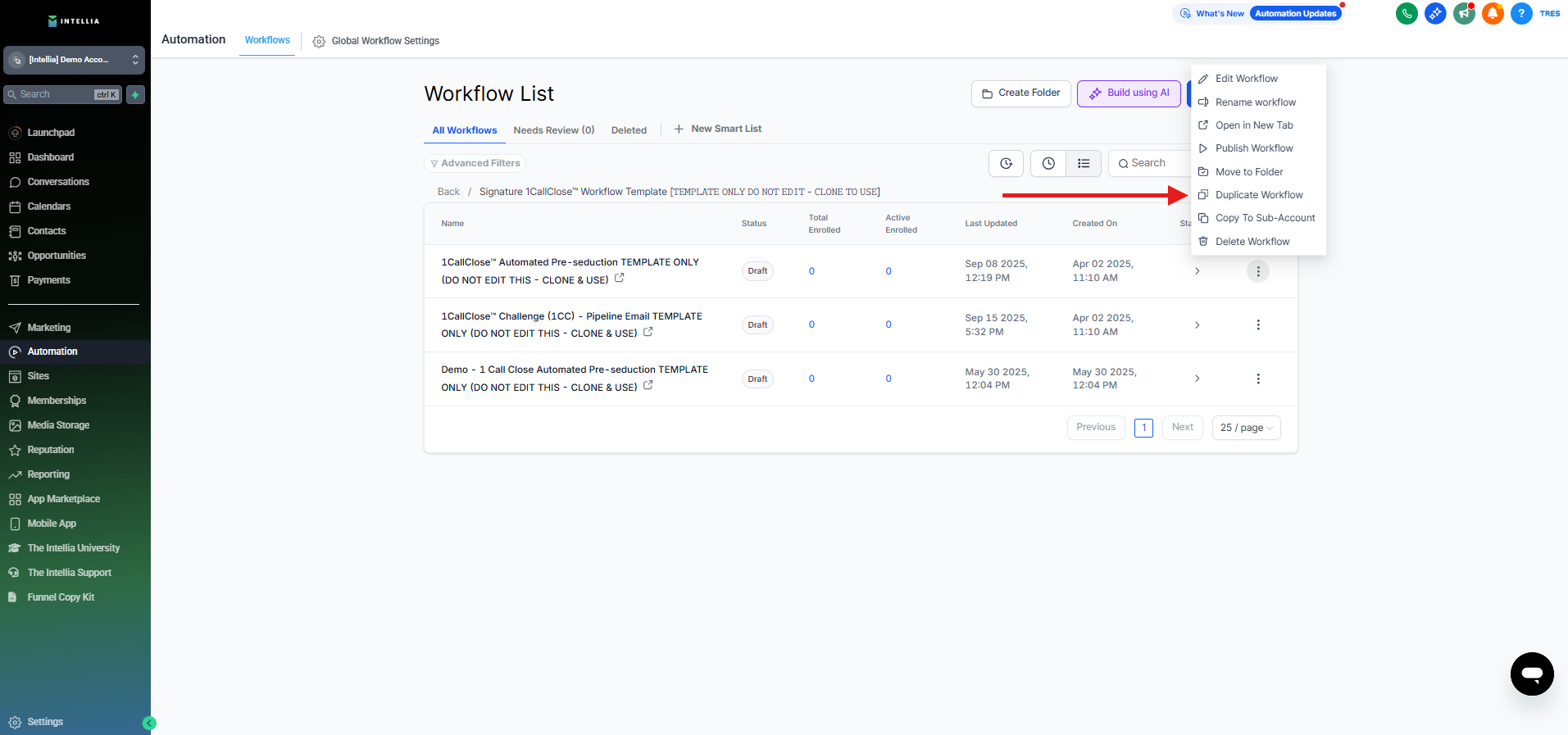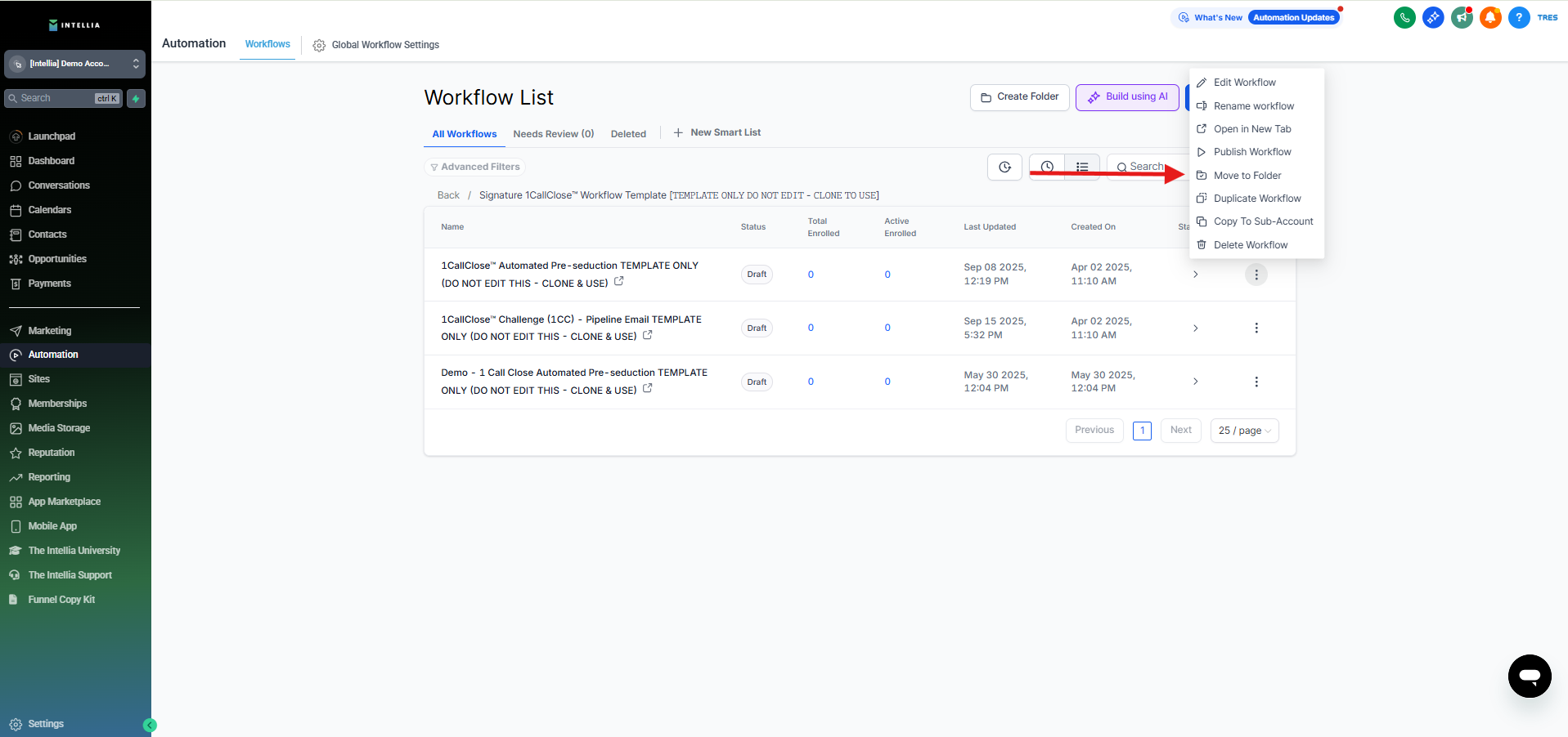 Step 1 : Click the Workflow you want to clone > Click the 3 little dot Icon