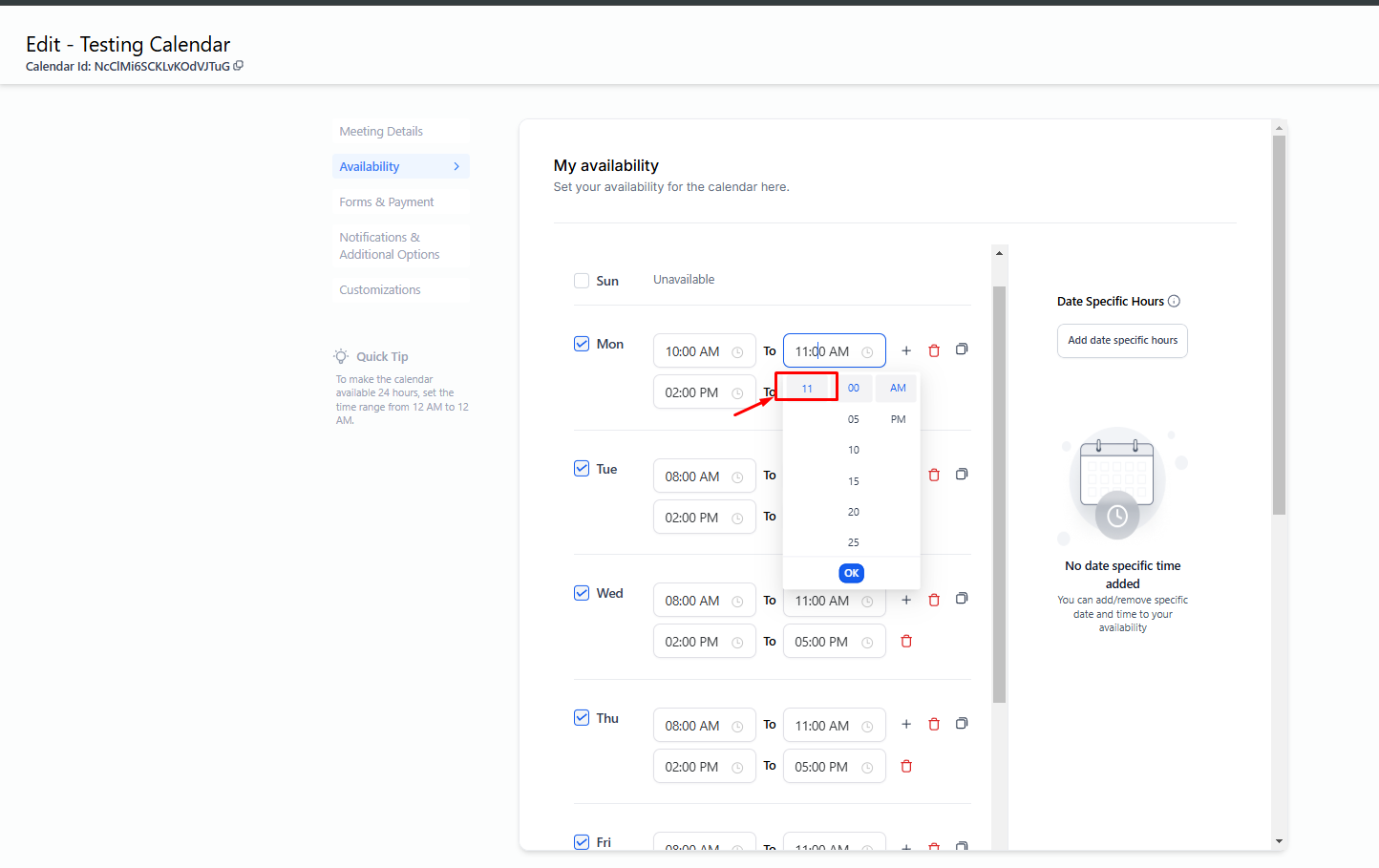 Step 18 : Here, you can adjust your availability. Click on "08:00 AM" to set your preferred consultation start time.