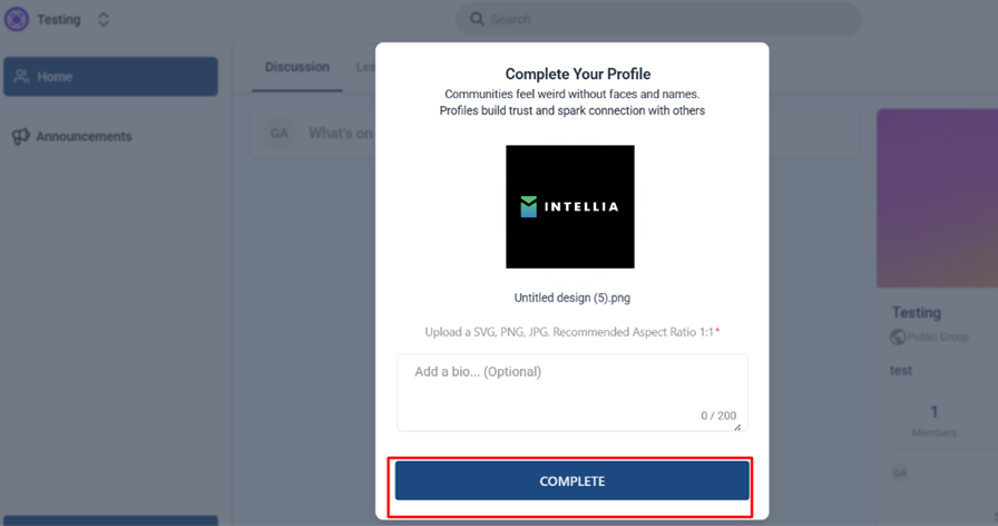 Please set your profile photo (recommended aspect ratio 1:1). Once you've uploaded your photo, click the "Complete" button.