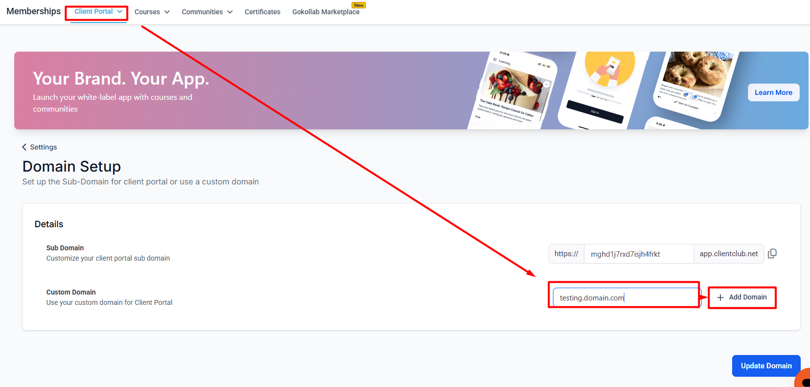 Go to Memberships > Client Portal > input your desired domain name > + Add Domain