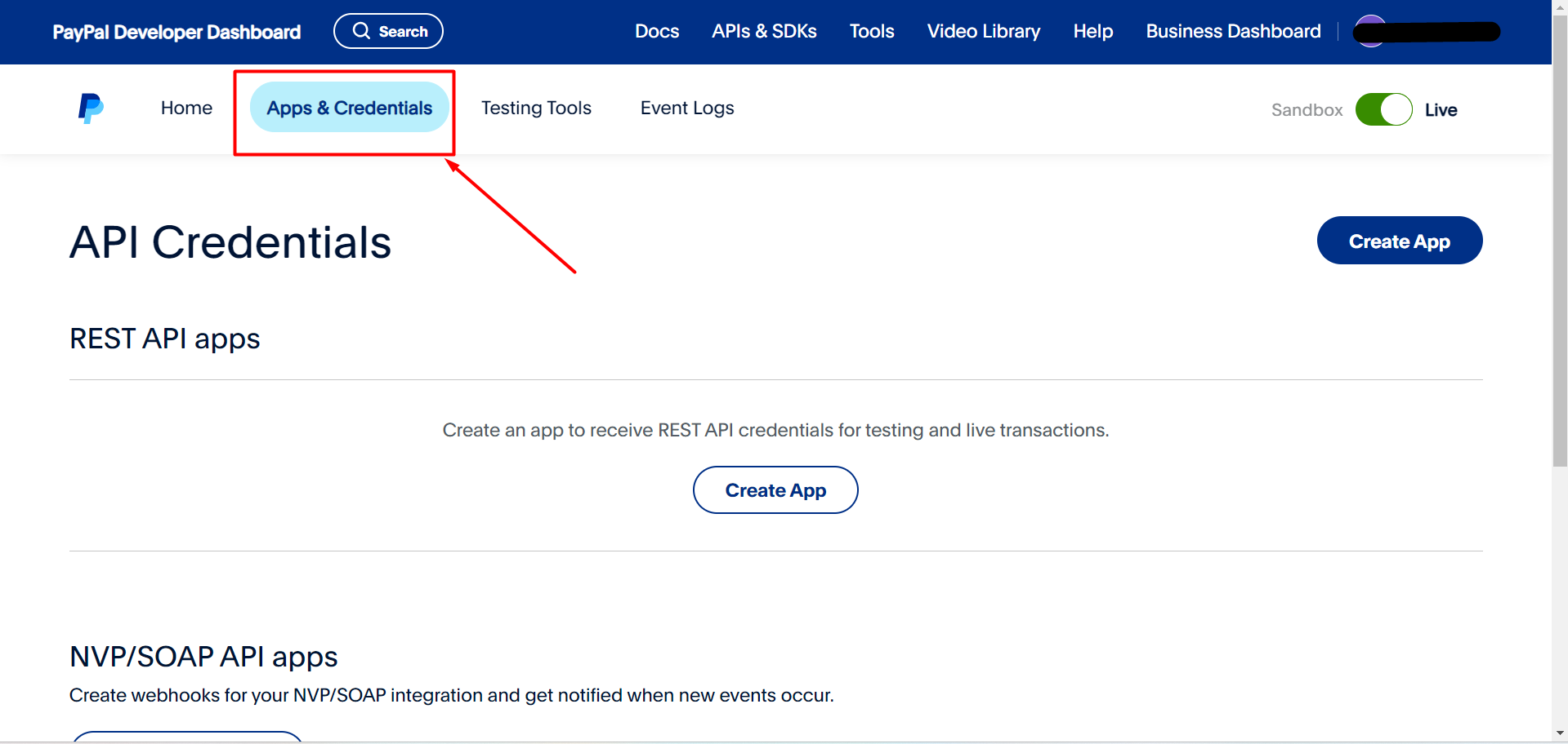 Visit developer.paypal.com to create or log in to your Paypal account.