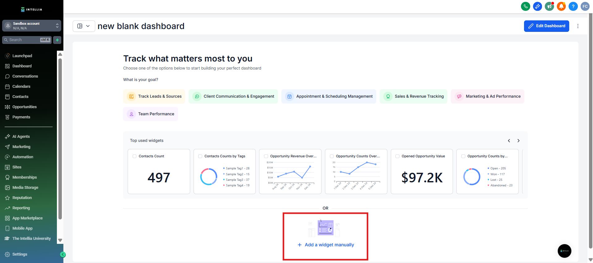 Use the "What is your goal?" or "Top used widgets" quick start options to select one or more popular widgets. This is what you see whenever a dashboard is empty (no widgets).