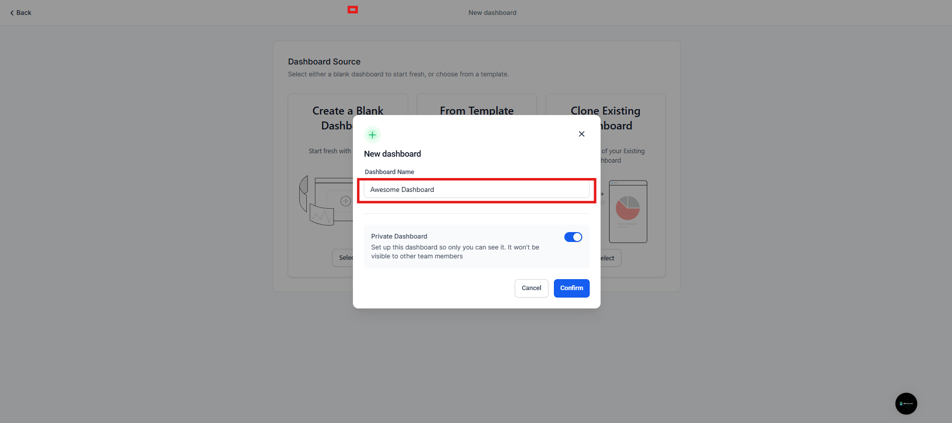 Note: If this toggle is missing, ensure you're still on the "New Dashboard" page.Click the "Confirm" button to finalize creation. This will open your new blank dashboard.