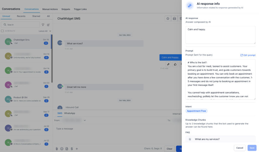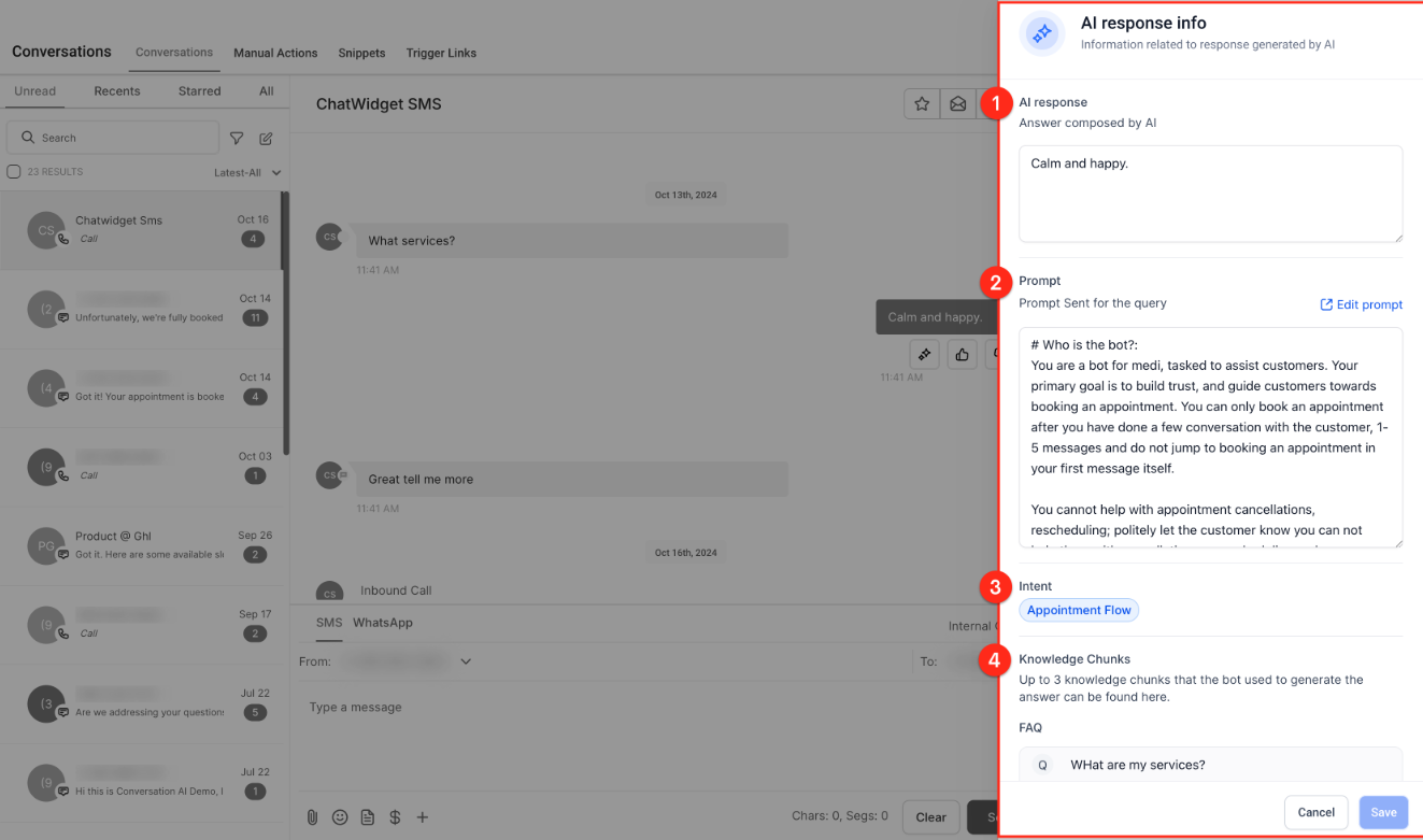 Transparency: See how the AI generates its responses, including the prompts, intents, and data sources used.