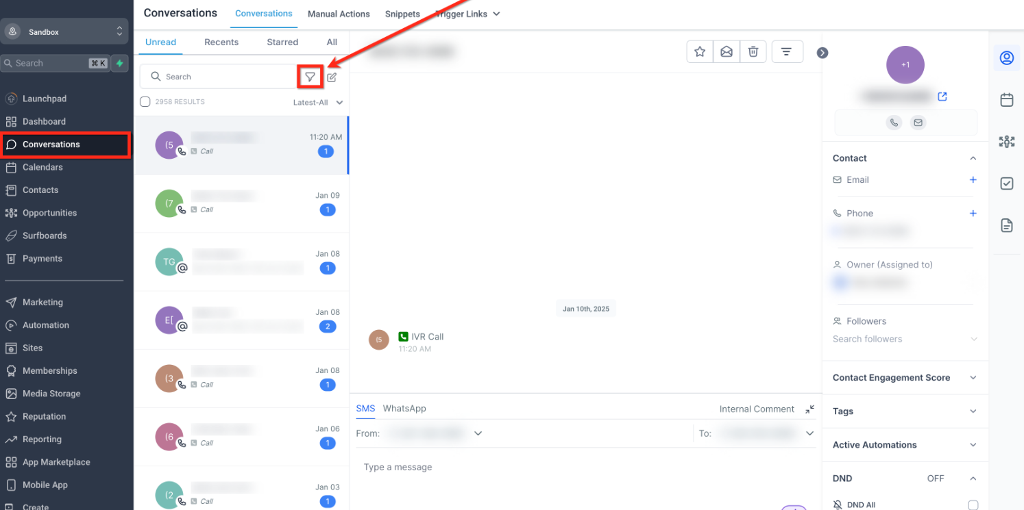 Click on the Filter icon in the Conversations panel.