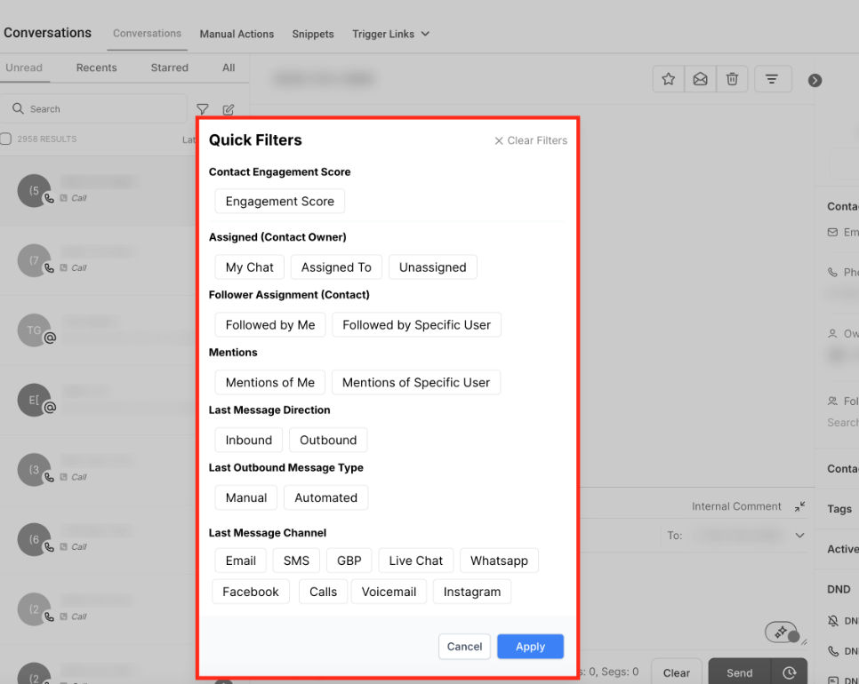 Filters help you quickly find specific conversations by: