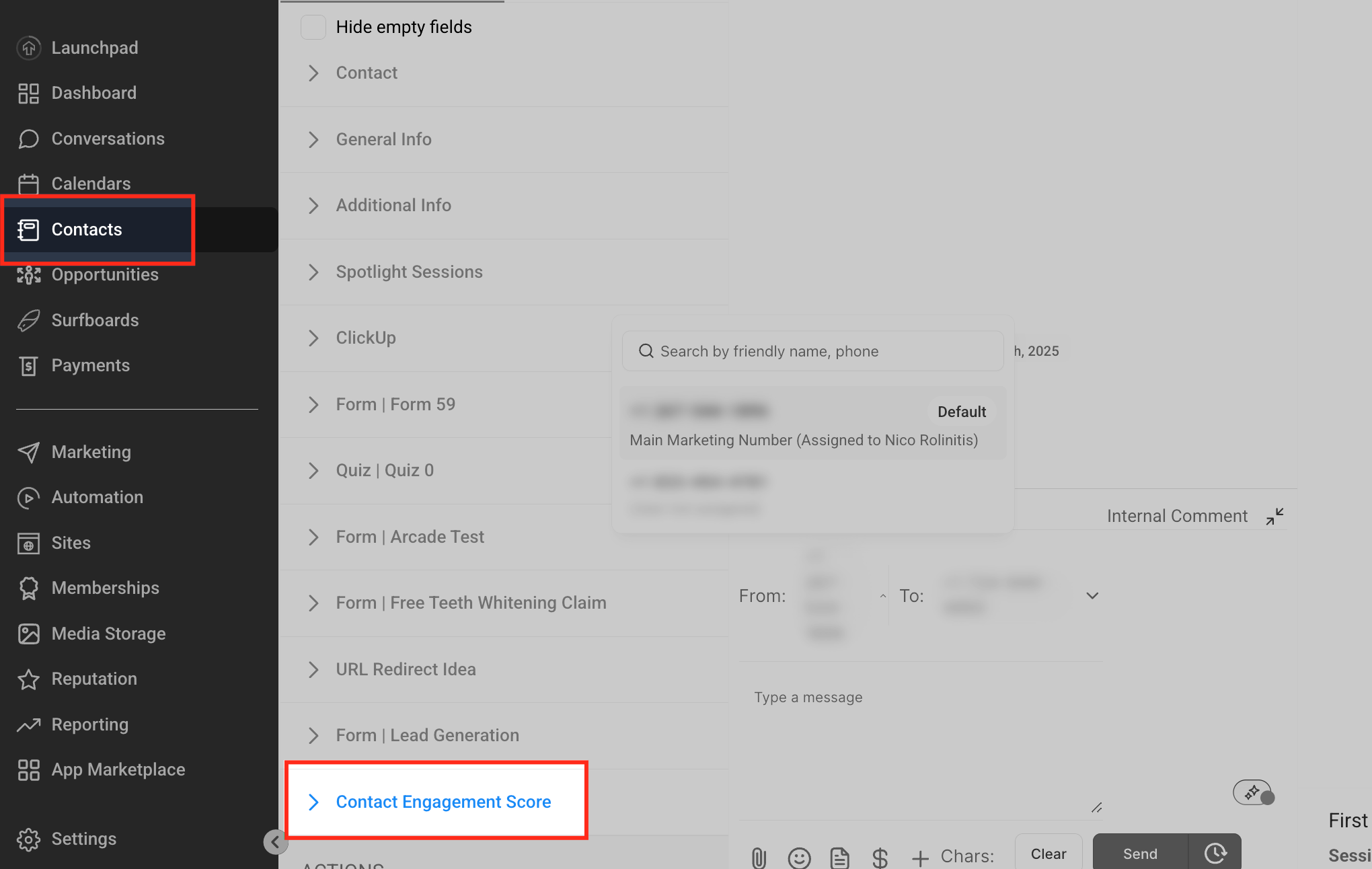 Inside an individual contact’s profile within the Contacts section, you need to scroll down to find the Contact Engagement Score dropdown among other details.