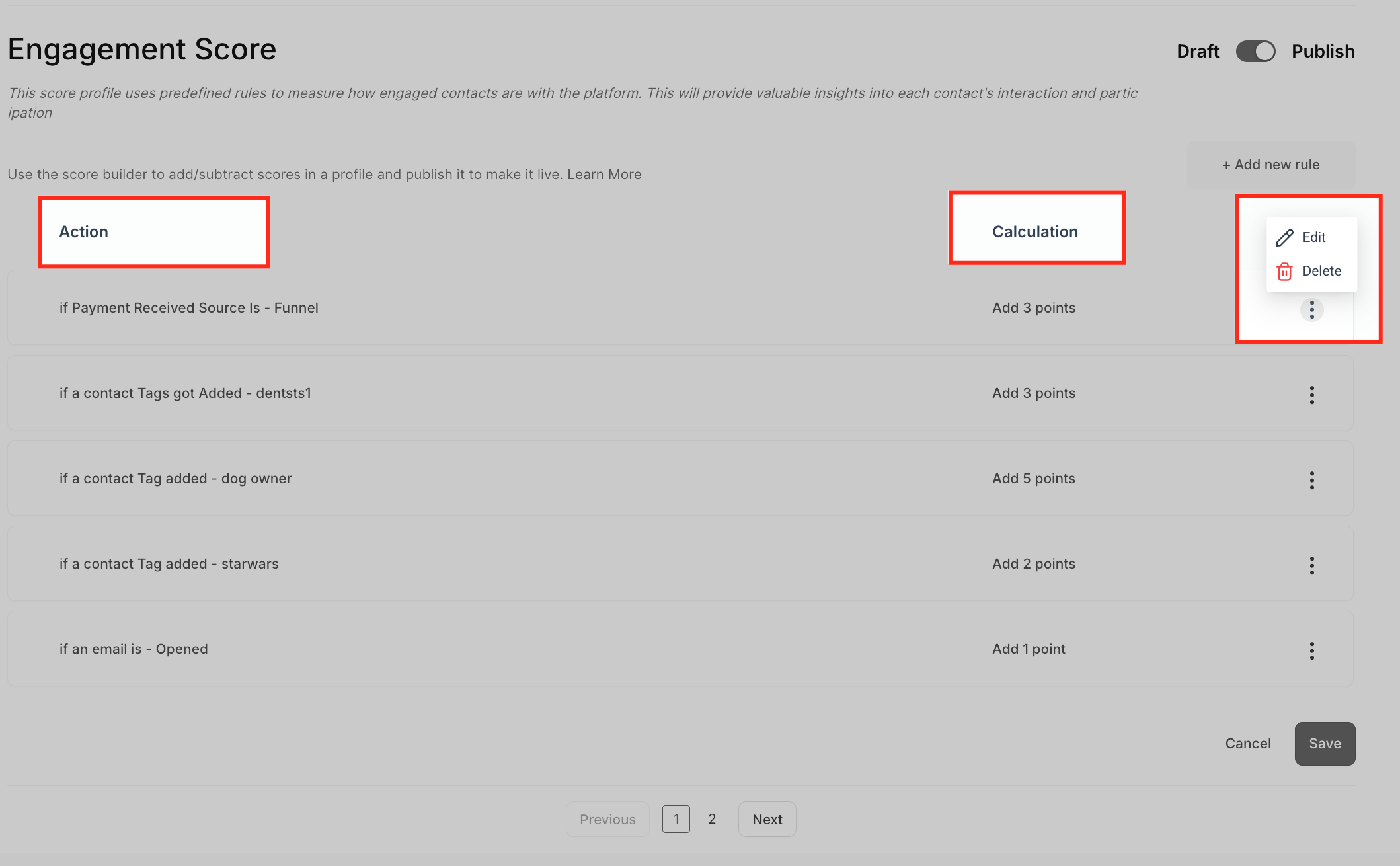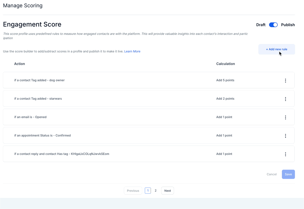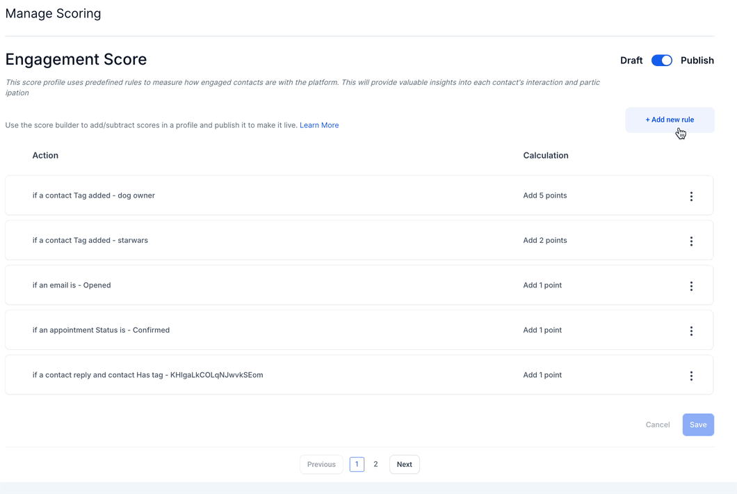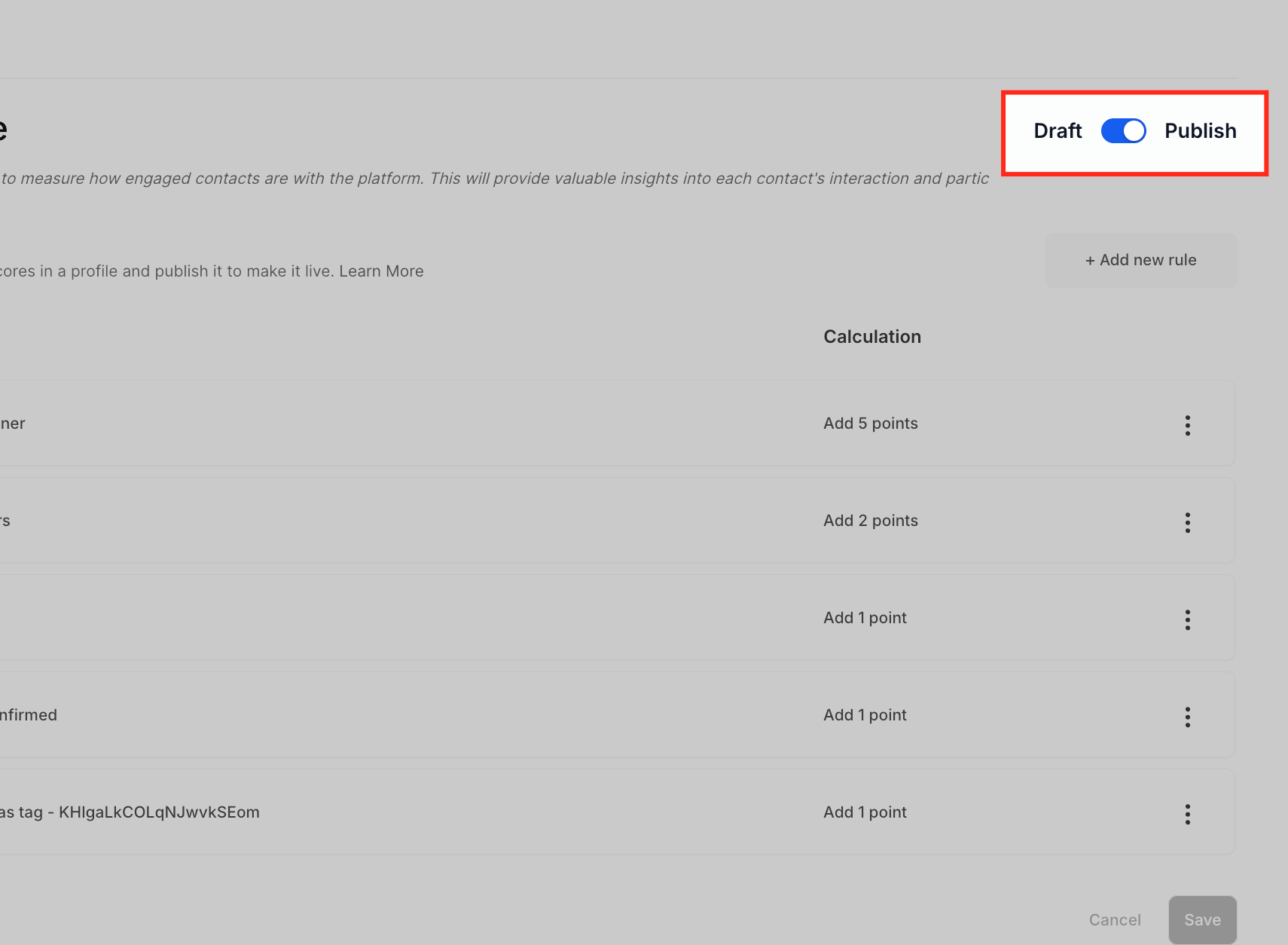 The Draft Mode allows you to make changes to engagement scoring rules without affecting live data. This is useful when setting up new rules or making adjustments before applying them to contacts. Once ready, switching to Publish Mode makes the score system active for all contacts, ensuring engagement tracking is updated in real-time.