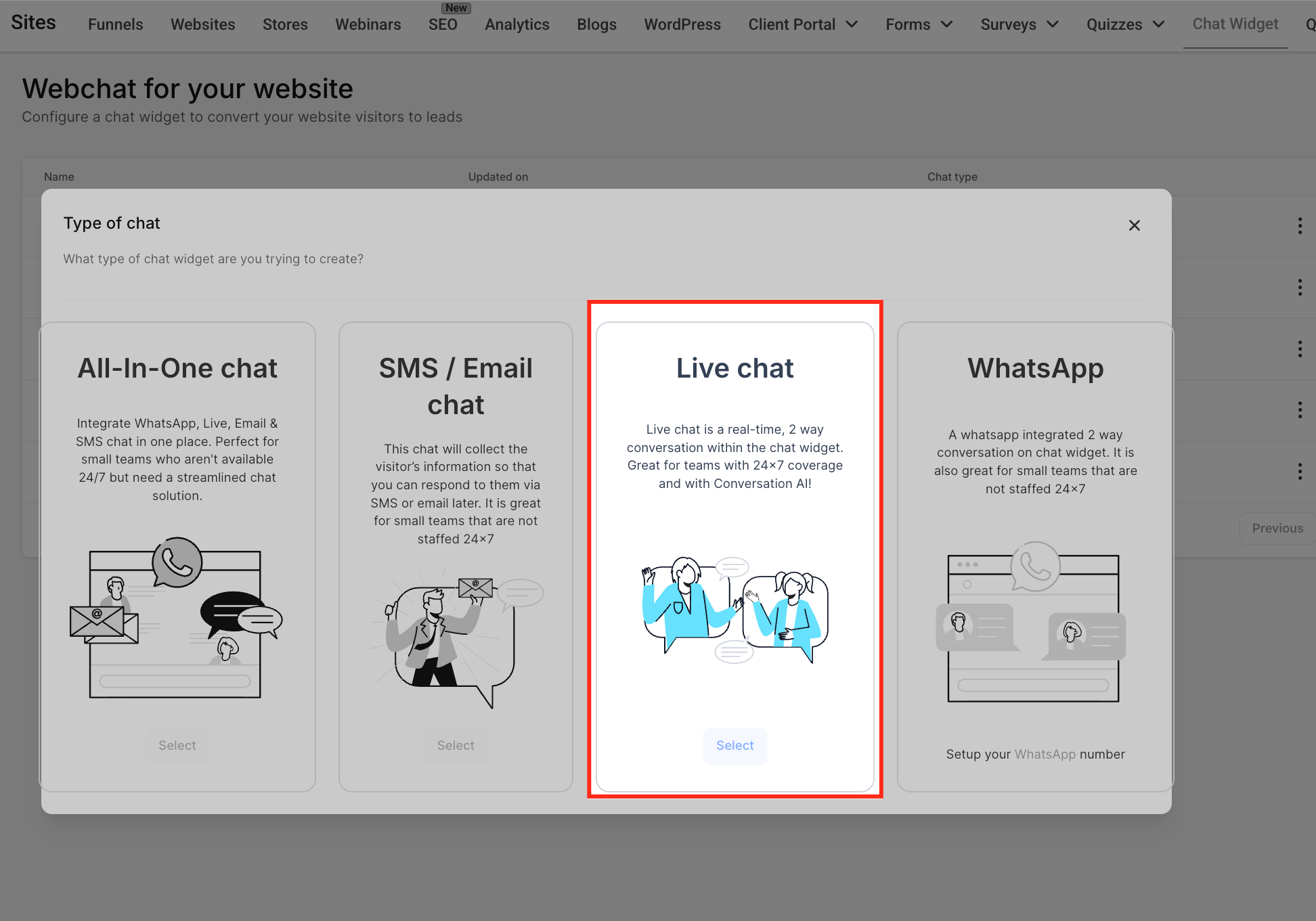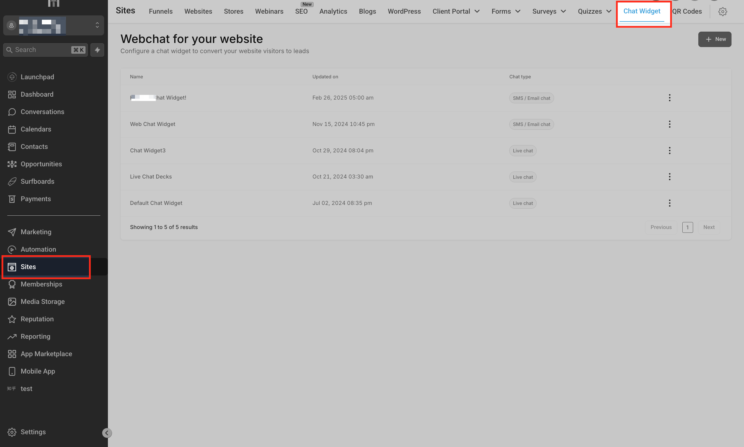 Go to Sites > Chat Widget. Click + New to create a new chat widget.