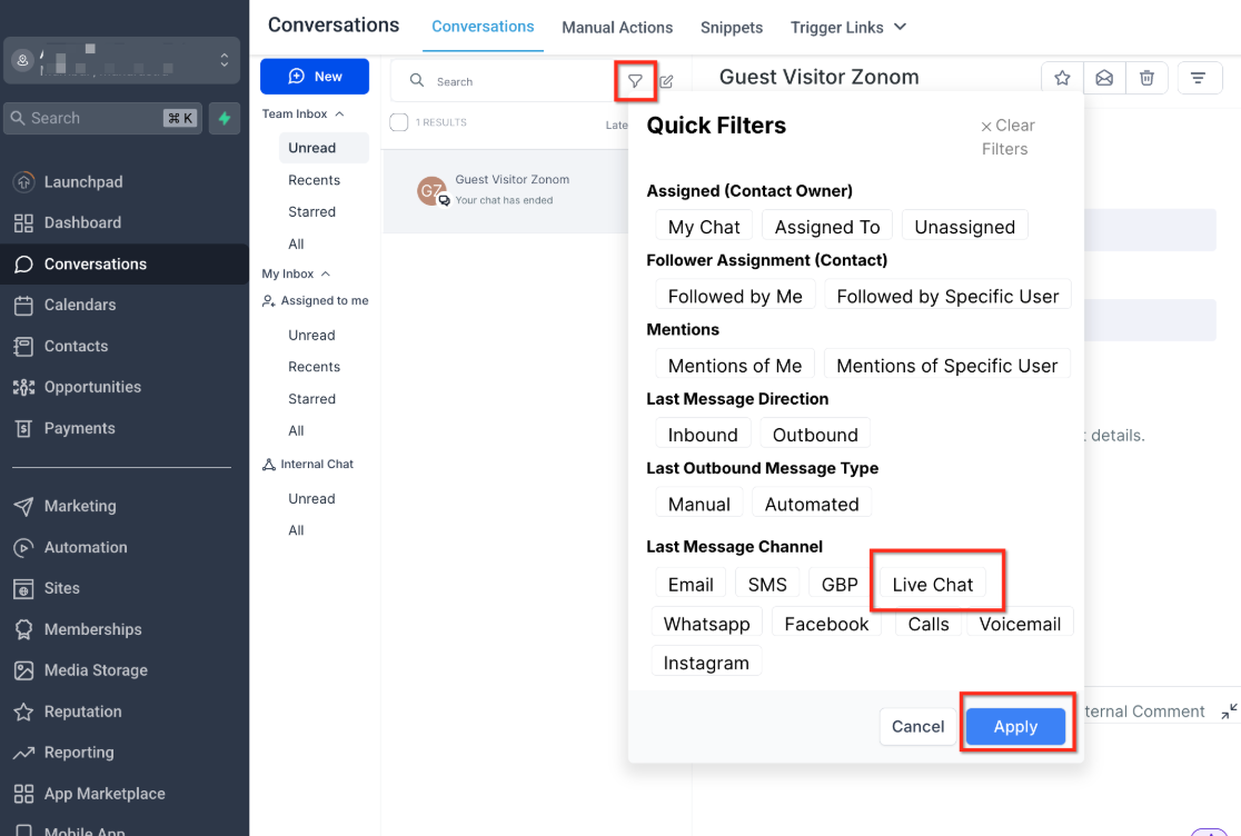 Q. Is it possible to filter and view only Live Chat conversations inside the Conversations section?
