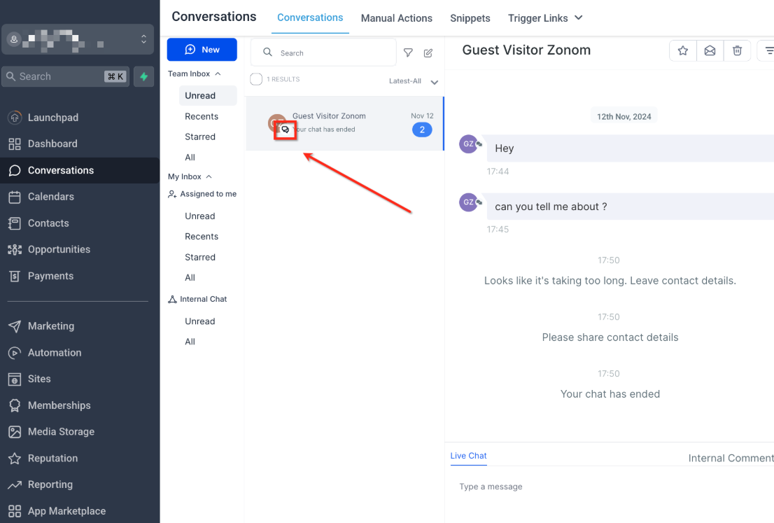 Open Conversations section. Live Chat messages appear in real-time in the inbox. You can identify live chat messages by looking at the chat icon. Click on a chat to view and send responses instantly.